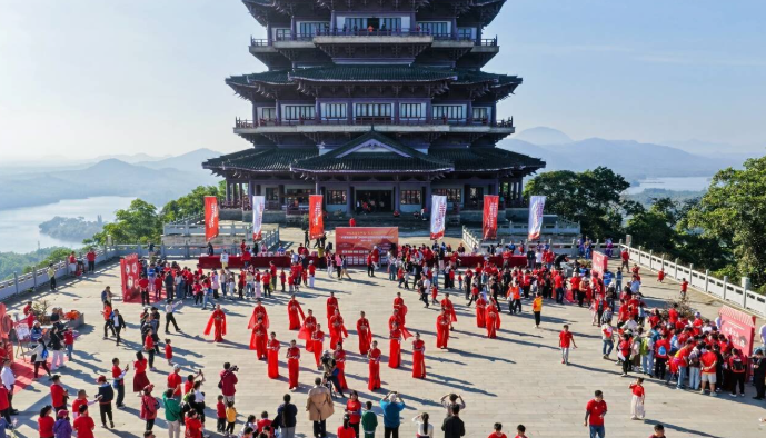 活动现场还设置了旗袍展示、舞狮迎宾等文化展演,以及集章打卡抽奖等互动环节,形成了“登山+文化+游戏”的立体体验模式。新年登高作为承载人们健康与幸福愿望的民俗健身活动,已成为儋州喜迎新年的重要标志。