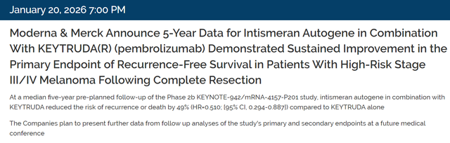 2026年1月20日,Moderna公布其个体化新抗原疫苗mRNA-4157(intismeran autogene)联合PD-1抑制剂帕博利珠单抗,用于高危黑色素瘤患者术后辅助治疗,在五年随访中展现出持续且显著的临床获益。与单用帕博利珠单抗相比,该组合疗法将患者的复发或死亡风险大幅降低了49%。