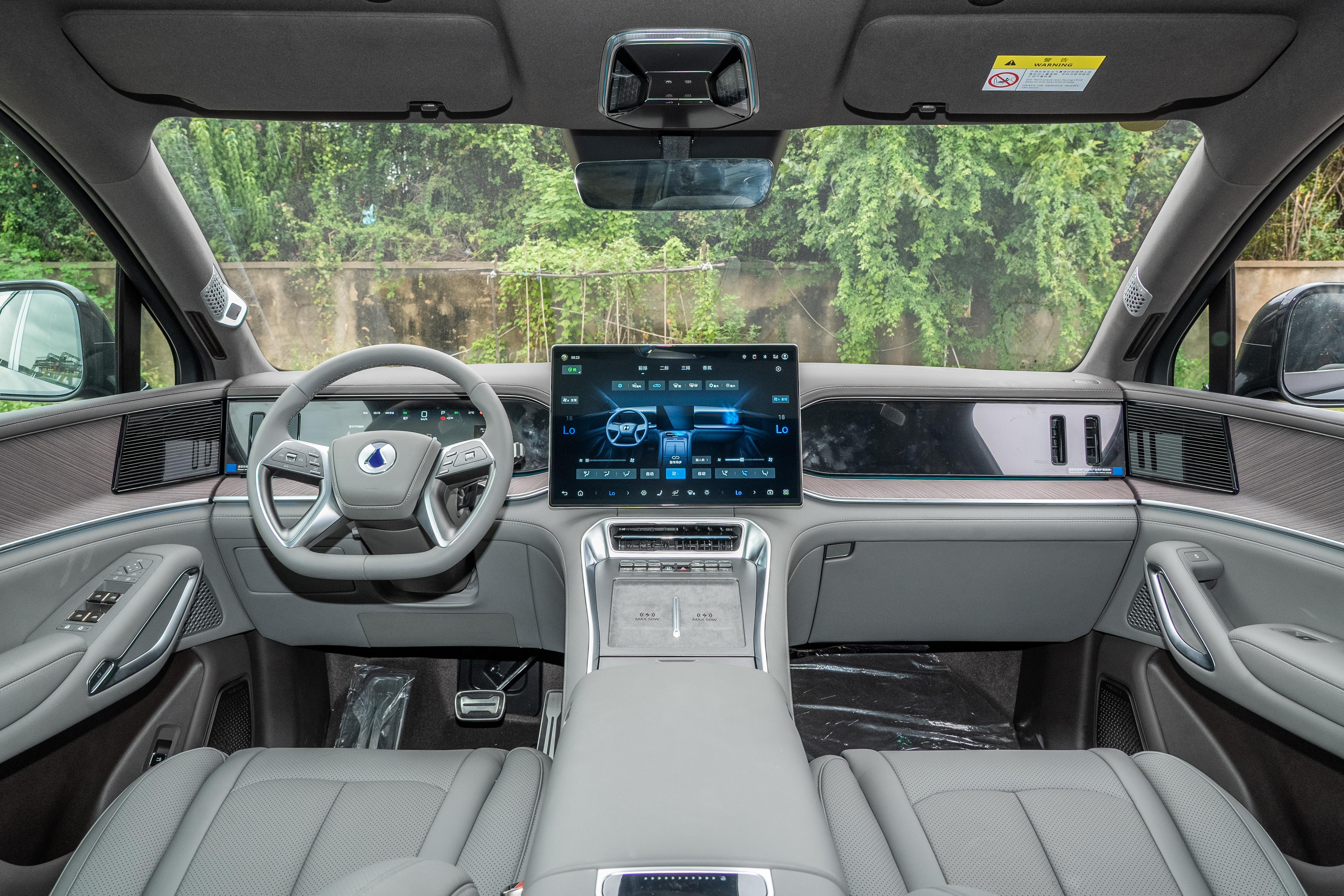 内饰设计的中规中矩,T型中控台采用对称式布局,配备了17.3英寸2.5K悬浮式中控屏、13.2英寸副驾屏与13.2英寸液晶仪表,中控台面与门板相连,形成包裹感较强的环抱式座舱,并且车内还提供了50英寸AR-HUD抬头显示,支持多屏联动。内饰配色有“金山棕”“云锦米”“铂檀灰”三种可选。棕色大气、米色素雅、灰色稳重,分别适合不同的审美需求。