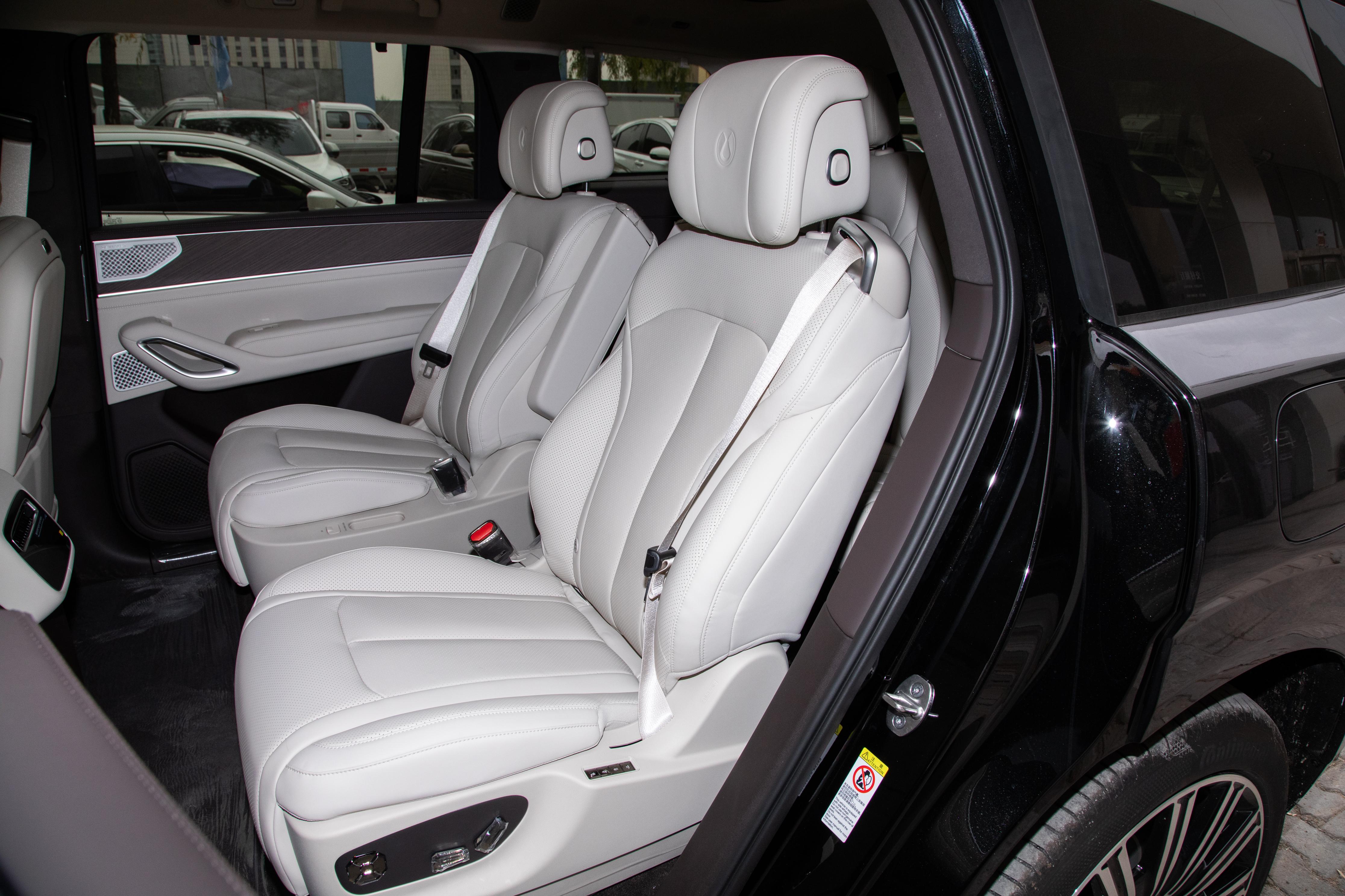 副驾为零重力座椅,支持一键放平与四向女王腿托。中排座椅除了常规的前后和靠背角度调节外,还支持横向移动,具备双50W无线充电、双小桌板、电动腿托与10点按摩功能。三排座椅支持六向电动调节,包括靠背、前后与坐垫抬升,可一键与二排联动形成双人床模式。