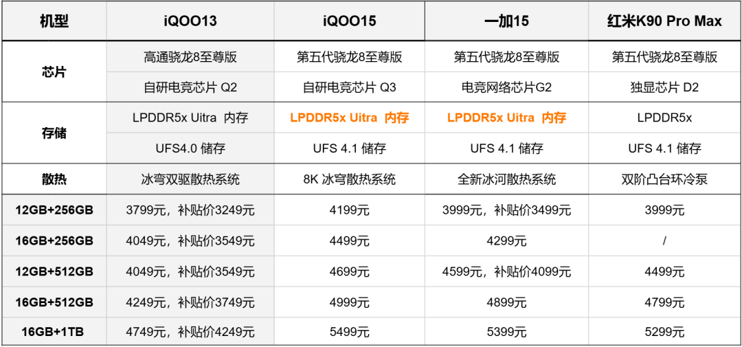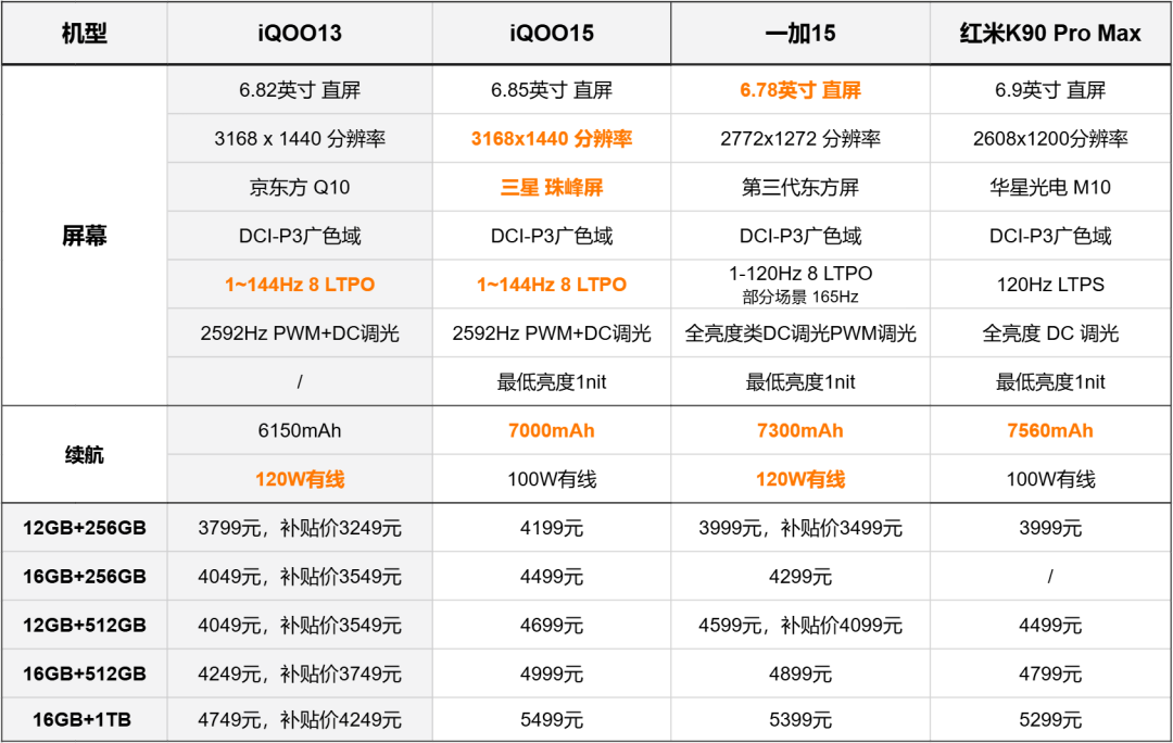 价格定位:iQOO15 > 一加15 ≈ 红米K90 Pro Max