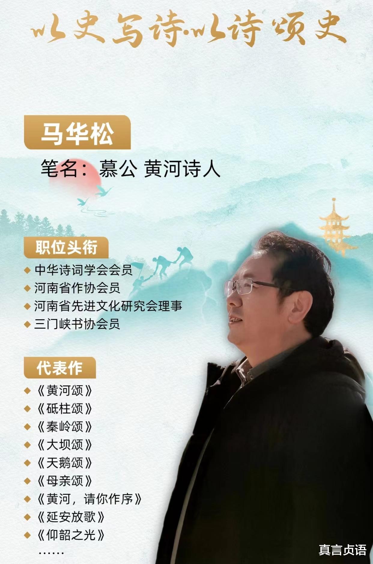 【马华松简介】马华松,笔名慕公,中华诗词学会会员,中华诗词学会科创诗词工委专家委员,河南省作协会员,河南省先进文化研究会理事,创作诗歌有:唱响幸福河“六部曲”《黄河颂》《秦岭颂》《砥柱颂》《大坝颂》《天鹅颂》《母亲颂》,文化产业“三部曲”,老字号“三部曲”,大美三门峡“三部曲”,歼疫“三部曲”等,其中《黄河颂》《天鹅颂》《仰韶之光》等数十首诗歌在学习强国App、新华网、人民日报客户端、北京头条、中国国际卫视、环球电视台、奔流、洛神等近百家媒体平台客户端刊(播)发,《黄河颂》《大坝颂》录入《三门峡诗词集成》。出版诗集《黄河颂歌》。《利剑净“网”护苗成长》荣获2022年度沿黄九省“扫黄打非•护苗”诗歌大赛优秀奖。