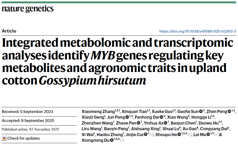 近日,安阳工学院教师张小萌博士以第一作者完成的研究成果Integrated metabolomic and transcriptomic analyses identifyMYBgenes regulating key metabolites and agronomic traits in upland cottonGossypium hirsutum在世界权威学术期刊《自然·遗传学(Nature Genetics)》上在线发表。