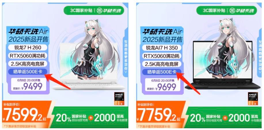 从目前的市场定价来看,华硕天选Air 2025(H 260+RTX 5060)版本国补之后的价格仅为7599元,如果叠加好评返500元E卡的话,到手价仅为7099元。而华硕天选Air 2025(H 350+RTX 5060)版本的国补后价格也只要7759元,同样好评返500元E卡之后,实际到手价仅为7259元。目前这样的价格优势,估计很难有小伙伴会拒绝了。毕竟,这样的价格入手一台RTX5060全能本,香味已经是溢出屏幕的存在了。