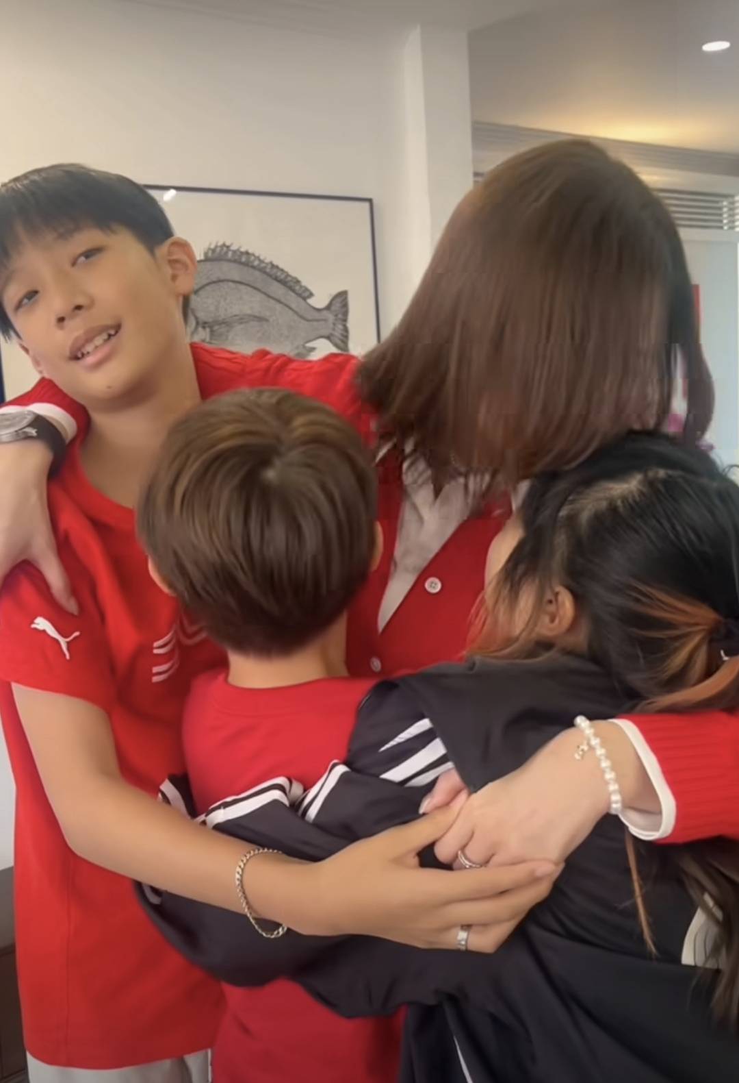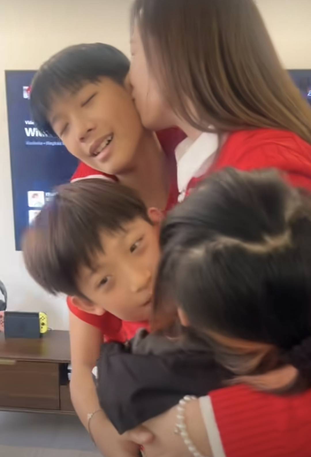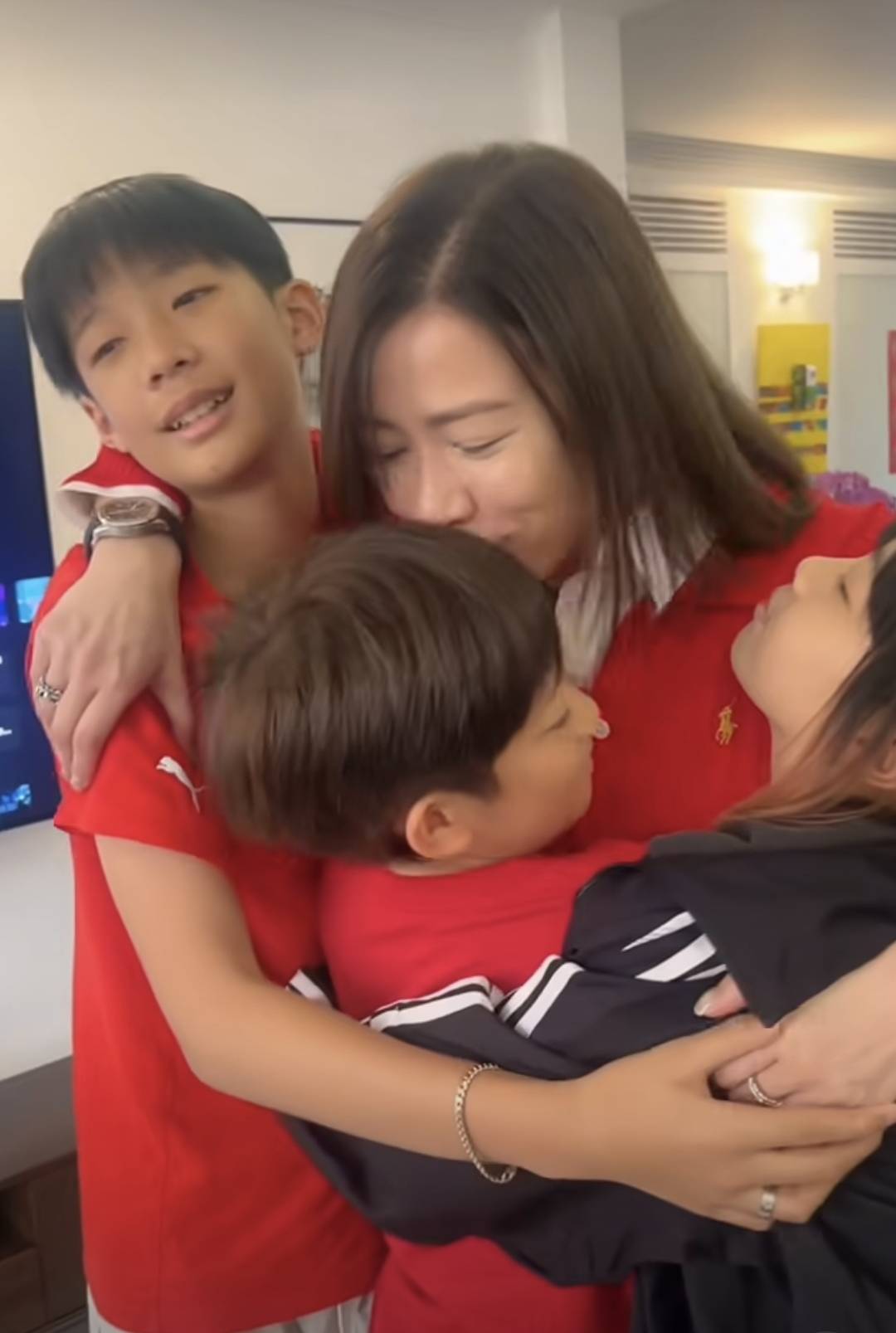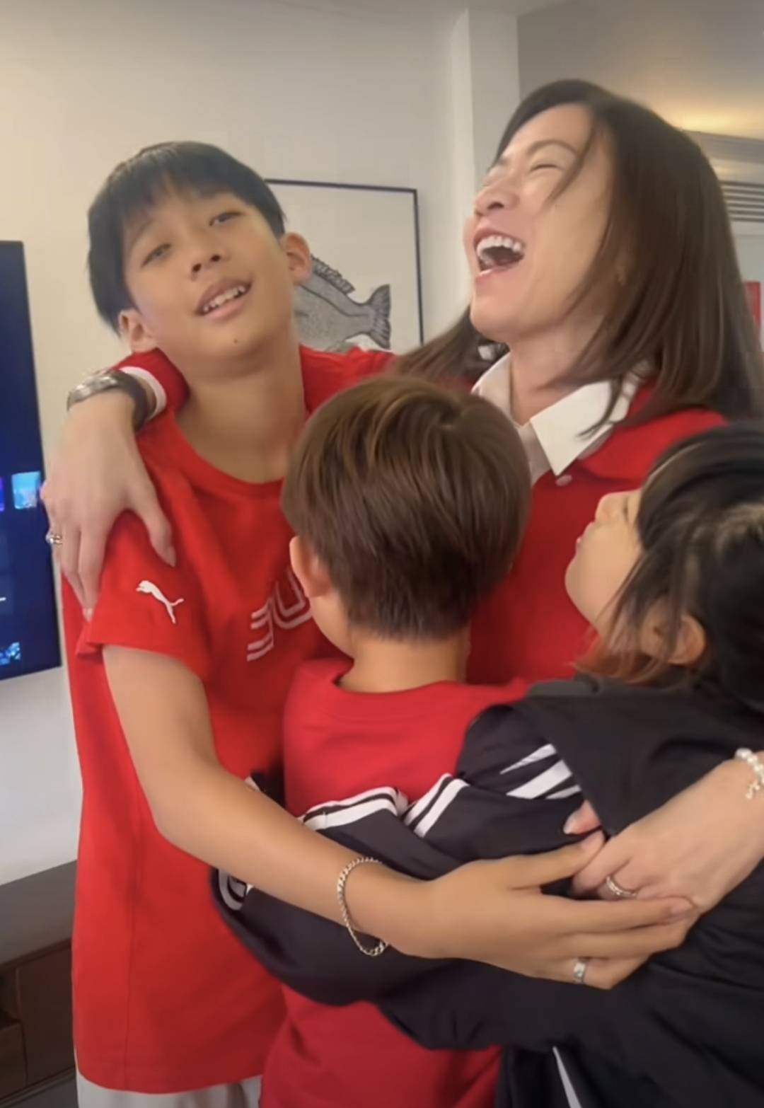 孩子们也紧紧的抱着干妈,画面很温馨,很热闹,也很幸福。看的出来,孩子们也很喜欢干妈,佘诗曼对干儿子、干女儿应该也是很宠爱的,从他们的亲近程度可以看出来。
