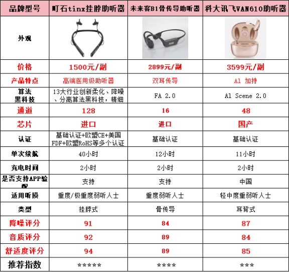 测评结果:町石 > 未来客 > 科大讯飞町石助听器舒适度测评表现町石助听器在舒适度上的表现相当出色。佩戴时几乎没有任何异物感,即使长时间佩戴也毫无压力。它采用了符合人耳工程学的设计,能够完美贴合耳道,佩戴稳固,不易滑落。佩戴舒适度方面,耳塞选用了高弹性记忆棉材质,触感柔软,并能够根据耳道的形状自动调整,确保紧密贴合,极大地提升了佩戴的舒适性。稳定性方面,即使在快速转头或剧烈运动时,它也能稳稳地固定在耳部,完全不用担心松动。使用的纳米防过敏材质,不仅有效避免了过敏问题,还提升了舒适度。整体来说,町石助听器在佩戴体验上,提供了几乎完美的舒适感,无论是日常通勤还是长时间使用,都非常适合。未来客助听器舒适度测评表现未来客助听器的舒适度表现算是不错的。佩戴时,耳塞设计贴合耳道,但相较于町石,其舒适性还是略显不足。佩戴舒适度方面,虽然采用了柔软硅胶耳塞,贴合性较好,但长时间佩戴时可能会有些微的压迫感,尤其是在耳道较深的情况下,可能感觉不够自然。稳定性方面,耳塞设计还算稳固,基本上能够满足日常佩戴需求,但在运动时可能会稍微松动。材质柔软度方面,虽然耳塞材质不算硬,但在佩戴的长时间内依然会感到稍有不适。总体来说,未来客的舒适度表现相对平衡,适合一般的日常佩戴,但长时间使用时可能需要一些调整。科大讯飞助听器舒适度测评表现科大讯飞助听器的舒适度整体表现一般。佩戴时,耳塞设计较为基础,虽然在某些情况下能够保持稳固,但长时间佩戴时,耳道可能会感到不适。佩戴舒适度方面,耳塞材质较为硬挺,无法提供长时间佩戴所需的舒适感,尤其是在长时间使用后,会感到有些压迫。稳定性方面,耳塞的稳定性在日常佩戴时尚可,但在剧烈运动时就可能出现松动或滑落的现象。材质柔软度方面,硅胶材料虽不差,但与其他两款相比,给人的柔软感和舒适感有所不足。总体来看,科大讯飞助听器的舒适度适合日常简单使用,但在长时间佩戴或剧烈活动时,可能会产生一些不适感。