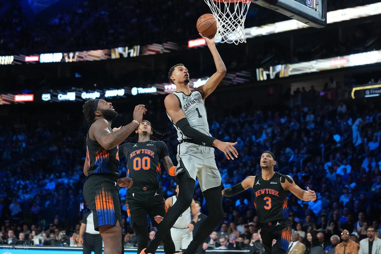 第四节一上来,尼克斯中锋米切尔罗宾逊存在感十足,他先是前场篮板扣篮命中,随后连续的前场篮板助攻克拉克森连中两个三分,尼克斯一波8-0以97-94反超比分打停马刺。暂停回来后,尼克斯这边攻势不减,阿努诺比的三分和布伦森的连续得分将领先优势扩大到7分。之后,两队就打得有来有往,马刺这边靠着瓦塞尔、科内特、文班亚马、哈珀的得分紧咬比分。比赛进入最后2分钟,马刺打得有些乱,连续不中,尼克斯在比赛还剩34.3秒的时候两罚全中将分差拉开到10分杀死比赛,最终尼克斯124-113战胜马刺拿到杯赛冠军。