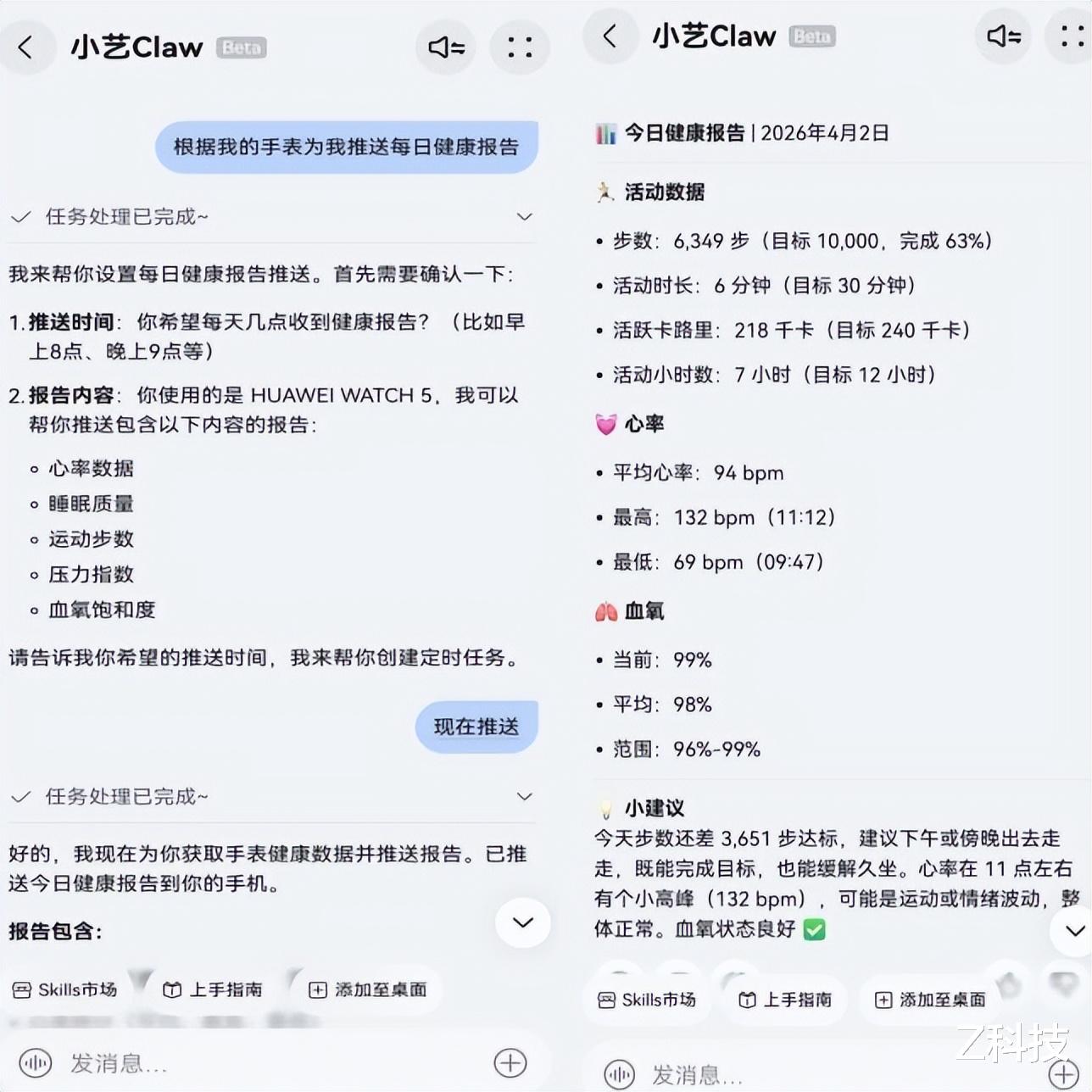 作为鸿蒙全家桶用户,小艺 Claw的多设备协同能力让我印象深刻。最近佩戴华为 WATCH 5 时刻记录自己的身体数据,戴了一段时间后,就可以让小艺 Claw生成独属于你的每日健康报告了,无需打开APP查看,设置好每日定时后,小艺就会将你每天的身体状态和健康信息主动同步给你,让你更了解自己身体的最佳状态,甚至还会给到你一些关于健康的小建议。