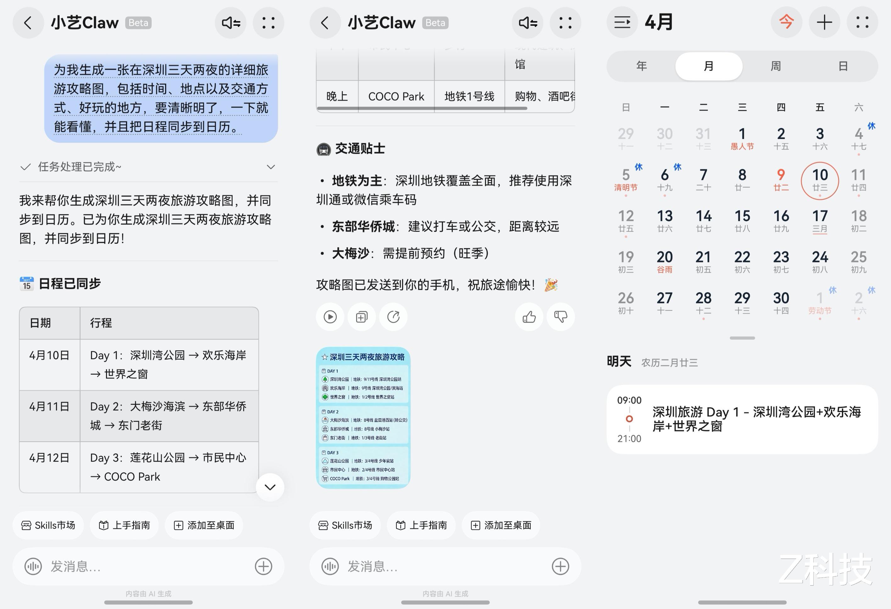 除了内容创作,小艺 Claw的规划能力也完全在线。朋友周末来深圳游玩,我让小艺 Claw生成一份详细的深圳 3 天 2 晚旅游攻略。小艺 Claw不仅梳理出了从深圳湾公园到世界之窗、再到大梅沙公园合理路线,还标注了每个打卡点的营业时间、最佳的游玩地点,甚至直接生成了清晰直观的攻略长图,一键就能分享给朋友,还能把日程添加到日历,妥妥的出行好帮手。