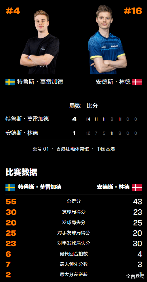 北京时间2025年12月10日晚,乒乓球WTT香港总决赛结束首日的最后一场男单对决,瑞典奥运亚军莫雷加德以较大的优势4-1淘汰丹麦名将林德,继林昀儒(中国台北)、大勒布伦(法国)、王楚钦(中国)之后拿到第4个男单8强的席位——莫雷加德VS林德战况与其他男单首轮比赛详情请看下文。