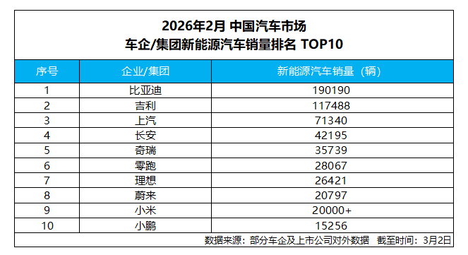 2026年开年,国内新能源汽车行业的竞争格局日渐明朗,比亚迪依旧凭借扎实的销量成绩坐稳行业头把交椅。根据企业公布的最新数据,集团2月新能源汽车销量共计190190辆,再度蝉联全行业销量冠军,在一众主流车企中保持着明显领先优势,靠实打实的市场表现,牢牢巩固着自身的头部站位。