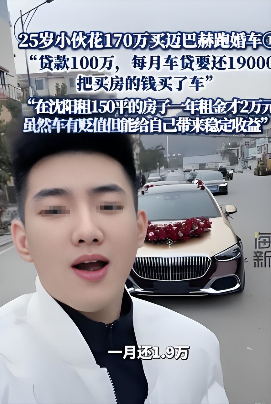 辽宁沈阳25岁的冷鹤放弃买房,贷款100万元购入170万元的迈巴赫,转而投身婚车租赁市场。他的账本清晰: