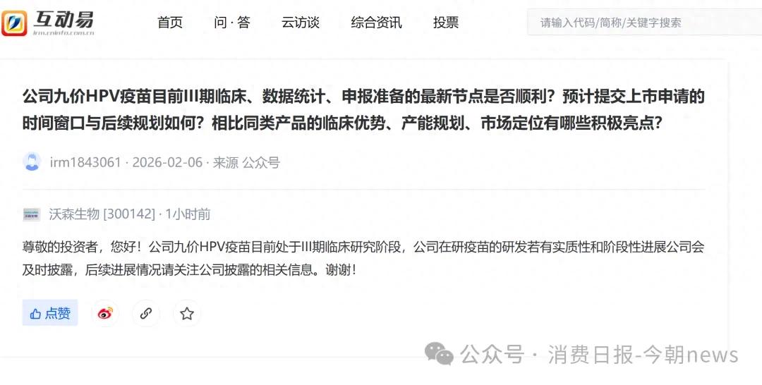 消费日报-今朝新闻讯,2月9日,沃森生物在投资者关系平台上答复投资者关心的问题。