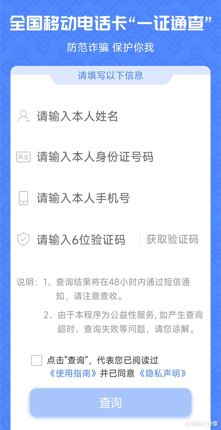 咱们点一下移动电话卡,然后输入你的姓名,身份证号码,手机号和验证码,等到几秒之后就可以收到相关短信,在短信里面就可以看到你的身份证名下有多少个手机号了!