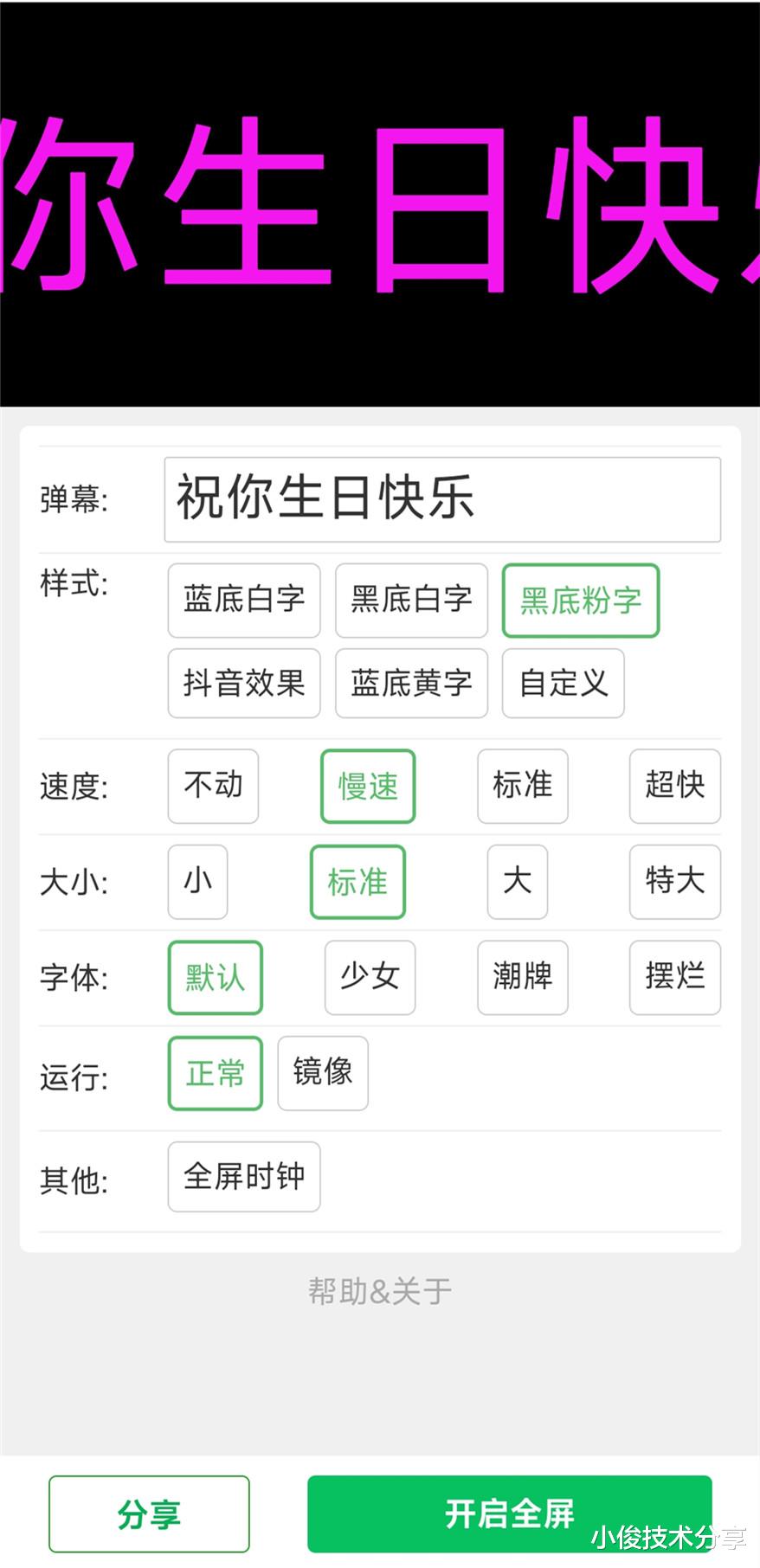 大家看,就是这样的效果,不仅可以快速的传递信息,而且可以增强氛围。比如说咱们给人家庆祝生日,就可以用这个功能给对方发送生日快乐,写好之后,咱们还可以选择不同的样式,有黑底白字,蓝底黄字,黑底粉字,以及自定义等等效果,下面的速度、大小、字体都可以进行选择,设置好之后,点击开启全屏,这样就能给生日的氛围增添一份色彩了。