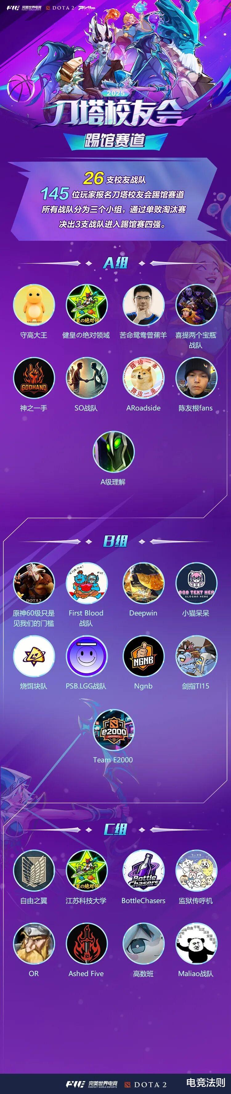 此外,刀塔校友会海选赛道报名已结束,26支校友战队和145位玩家报名参赛。海选赛也于明日开启,26支战队分三个小组,通过单败淘汰赛决出三支战队进入踢馆赛道四强赛,与Ori曾焦阳组建的战队争夺踢馆赛冠军,最终踢馆赛冠军将在完美世界电竞中心线下挑战主赛道冠军。