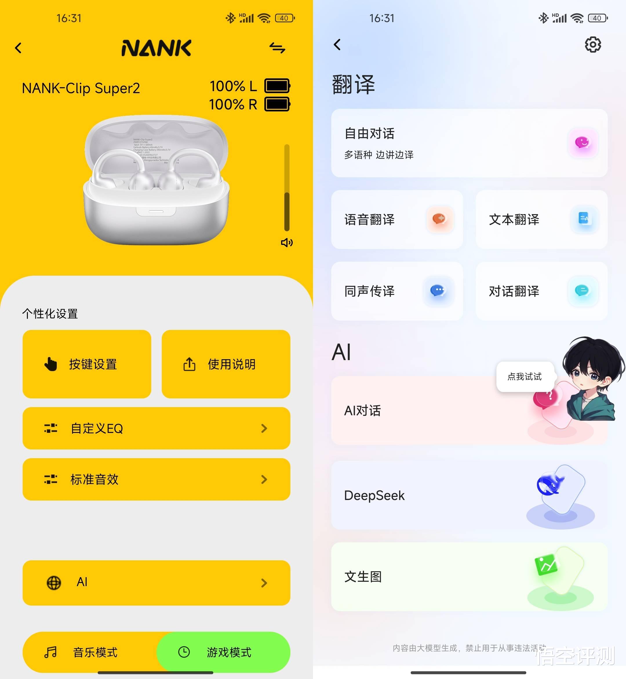 无论是大家日常需要的语音翻译、文本翻译,还是进阶的同声传译,都可以轻松搞定。对比直接使用手机AI来说,南卡ClipSuper2使用起来更加自然而且快捷高效。由于集成了DeepSeek以及讯飞等多个大模型,实际使用感受非常不错。