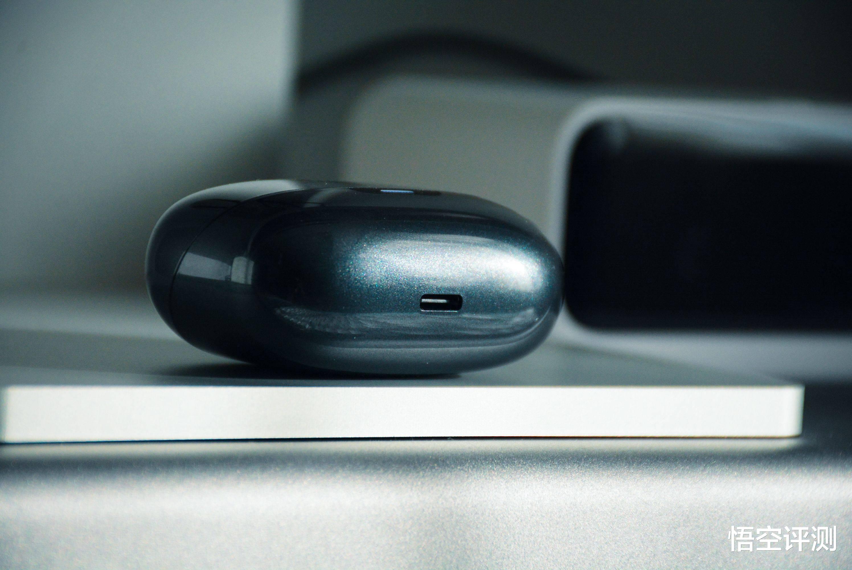 充电仓设计的非常精致,亮黑色的设计非常美观,有一种钢琴黑的质感,显得很高端。