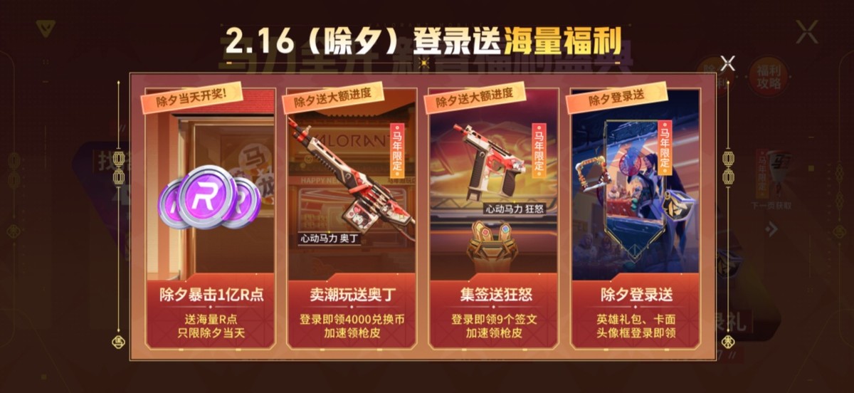 福利体系拆分为五大板块,覆盖登录、活跃、社交、收集、付费等多个维度:更新登录送7日英雄招募加速+R点概率掉落;版本介绍互动送限定卡面;限时免费皮肤体验+奥丁永久皮肤任务;情人节组队活动解锁双人主题道具;生肖扭蛋收集(集齐12枚除夕领20R点);以及最重磅的除夕当晚1亿R点奖池抽奖。