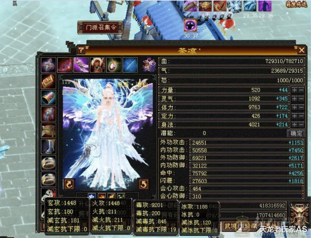 先看面板:血量78万,蓝量2.9万,内功攻击5万,命中7.5万,闪避2.7万,会心攻击464,会心防御310!毒攻击9201,玄攻击1448,火攻击1448,冰攻击1188!