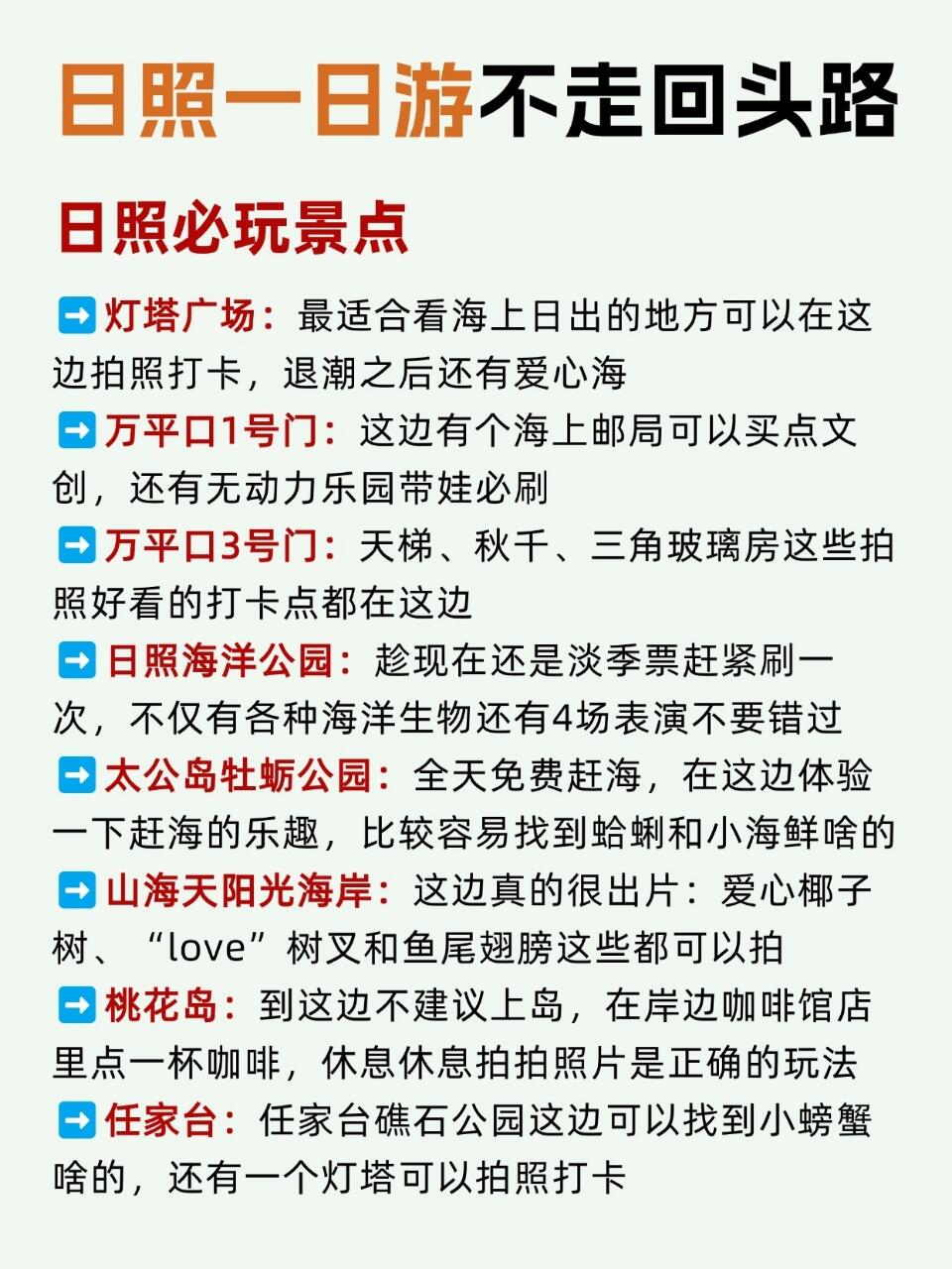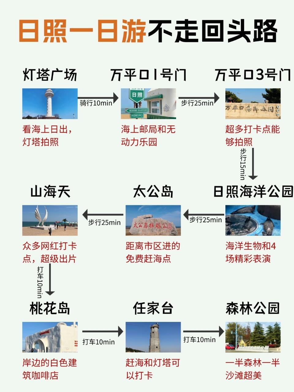 🌍灯塔广场➡️万平口1号门➡️万平口3号门➡️日照海洋公园➡️太公岛牡蛎公园➡️山海天阳光海岸➡️桃花岛➡️任家台➡️森林公园