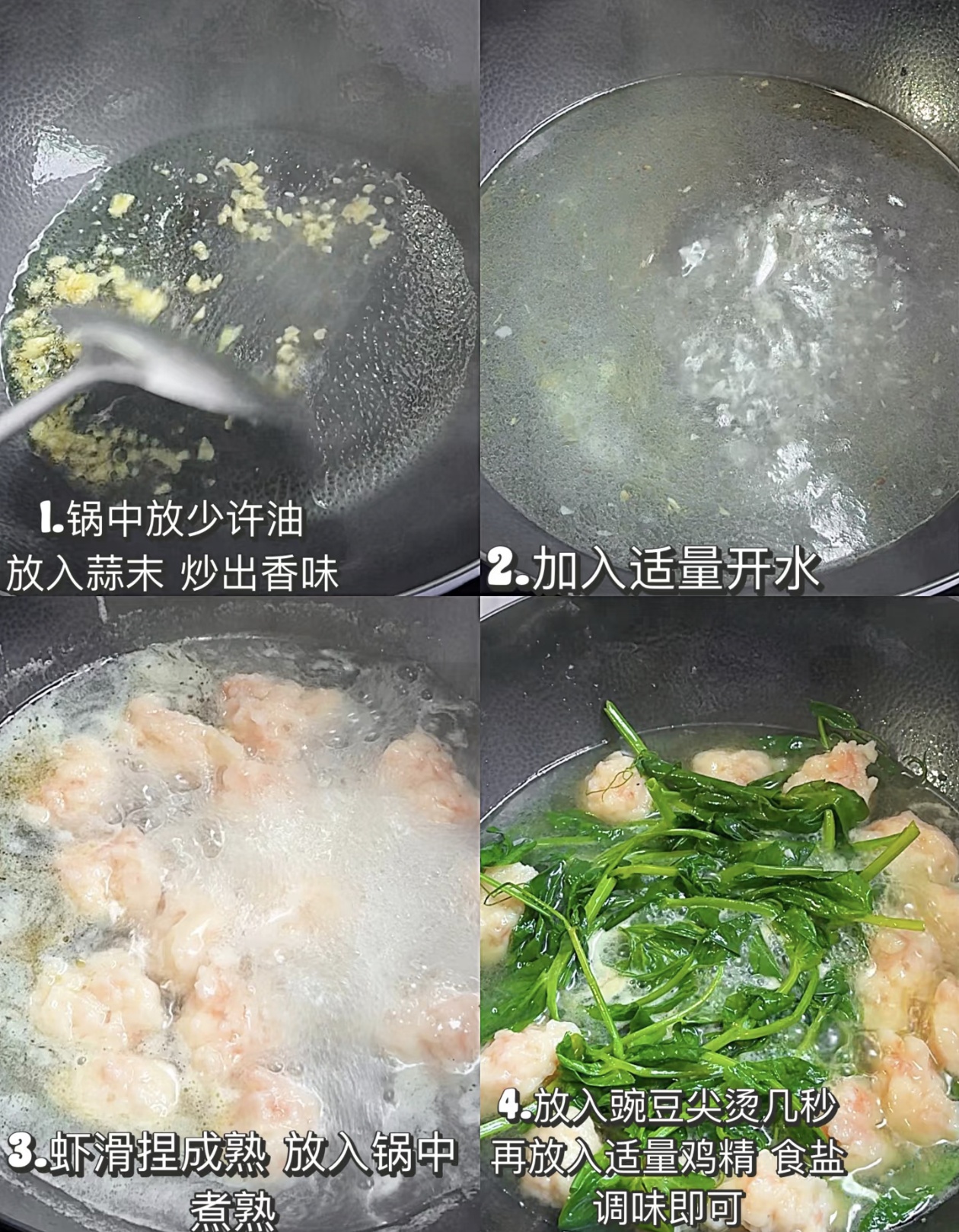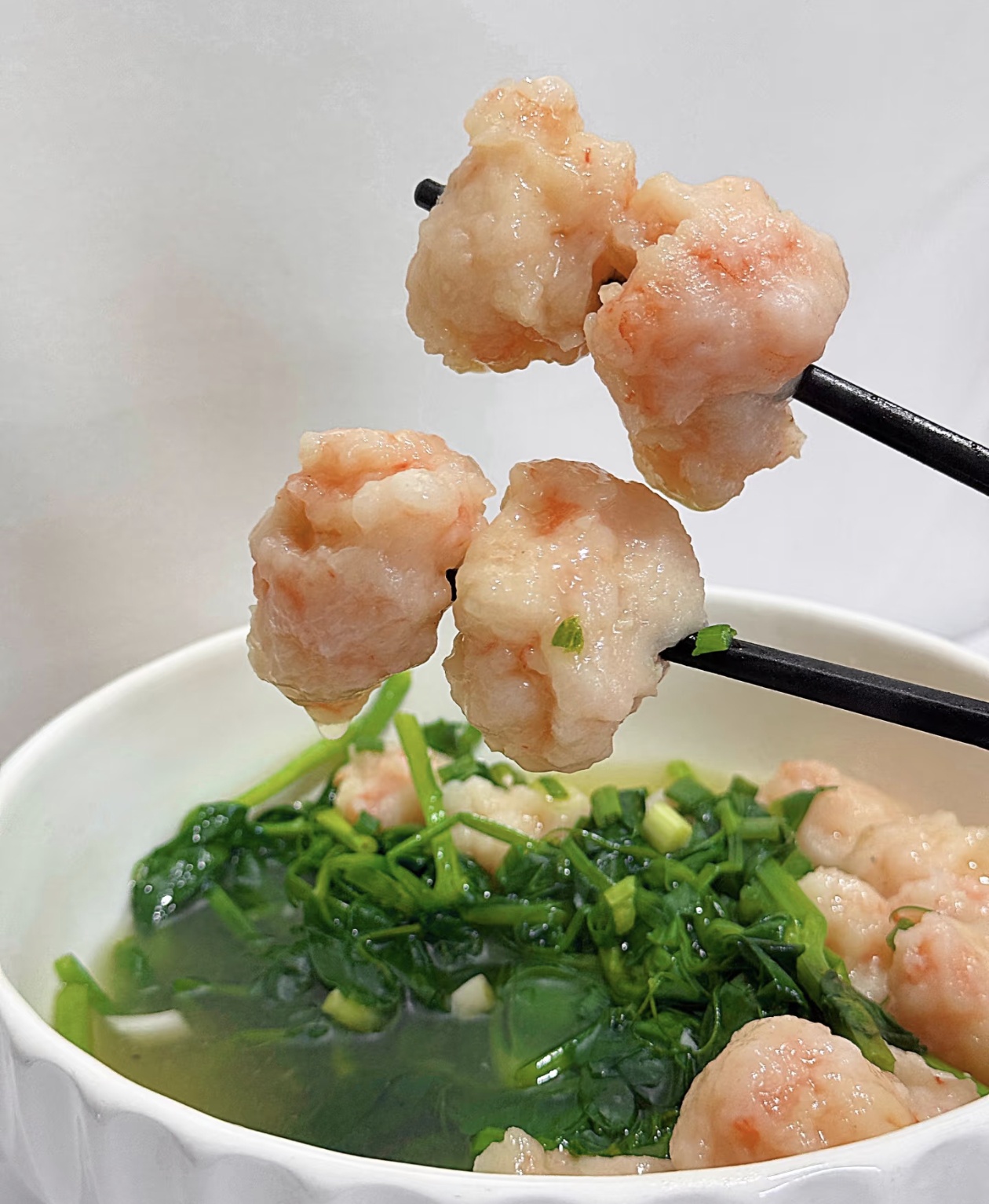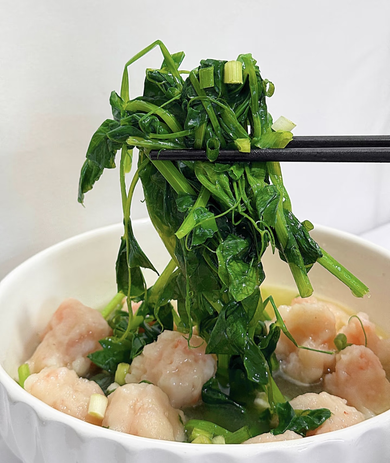 出锅前,撒上一把切得细碎的葱花,翠绿的葱花点缀在奶白的汤面和粉红的虾滑之间,视觉上就先让人食欲大开。趁热盛一碗,先喝一口汤,蒜香、虾鲜和豌豆尖的清甜在口腔里层层绽放;再夹起一颗虾滑,Q弹的口感在齿间弹跳,满满的都是虾肉的鲜甜;最后尝一口豌豆尖,脆嫩中带着独特的清香,解腻又爽口。