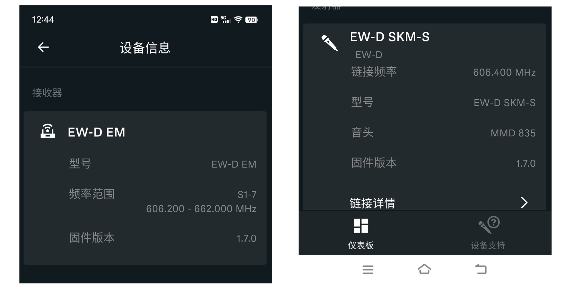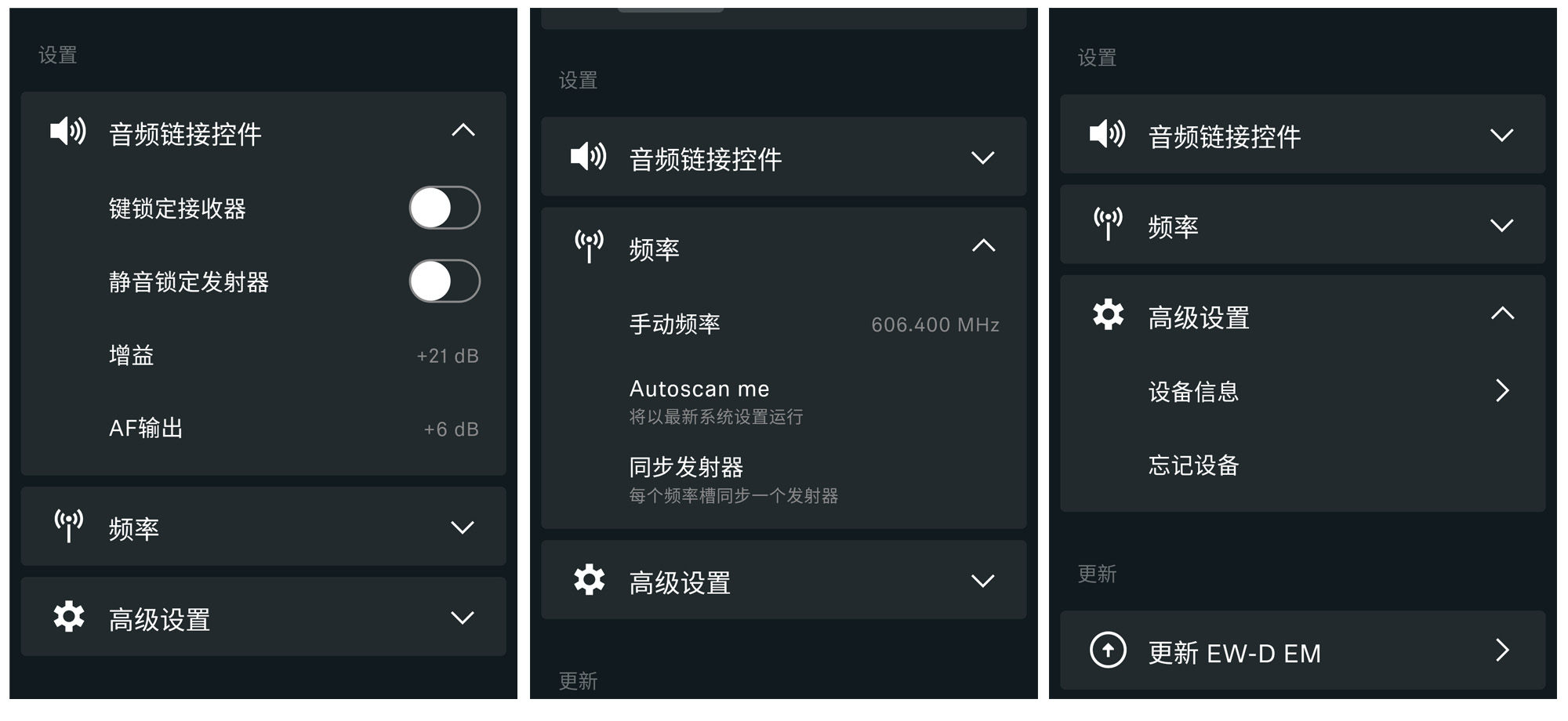 所有控制项目均可在接收机的操作面板上进行,同时也可以在软件中远程控制。从控制类型来看,均为常用操作。例如,“音频链接控件”(图左)中的“锁定接收器”(用于将接收机切换到待机状态) ,“静音锁定发射器”(用于发射器静音),以及增益、AF输出(射频信号输出)。“频率”(图中)中的“手动频率”、“同步发射器”(可在手持发射器上操作)。“高级设置”里是针对系统信息和链接管理的操作。下图显示了系统信息内容。