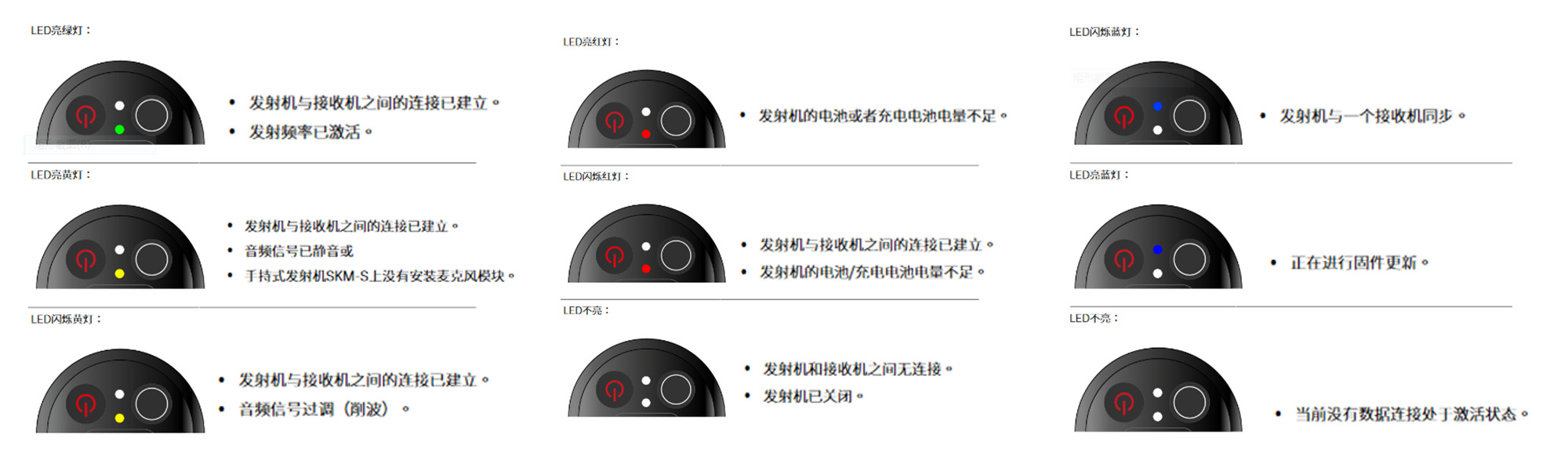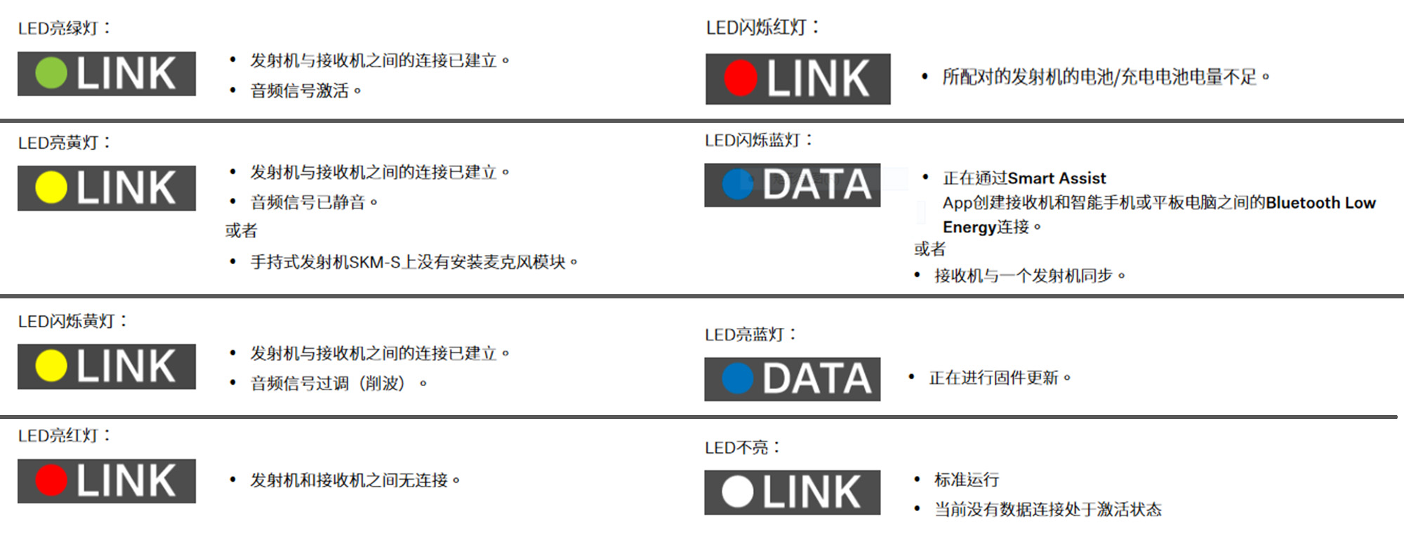 在手持发射机部分,同样提供了LINK和DATA状态灯。不同工作状态见下图所示。