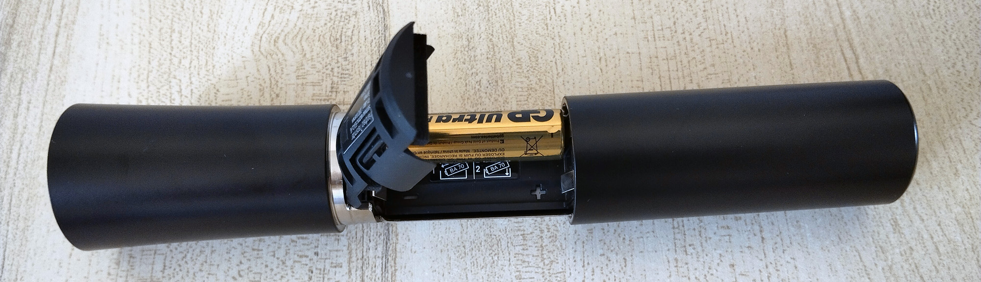 手持发射机提供两种供电方式,可以使用BA 70锂电池(非标配,可选购,优点是可快速充电)续航12小时,以及普通AA电池应急方案(8小时)。发射器尾部电池仓采用通用设计,直接打开后盖即可更换电池类型,无需工具或改装。见下图所示。