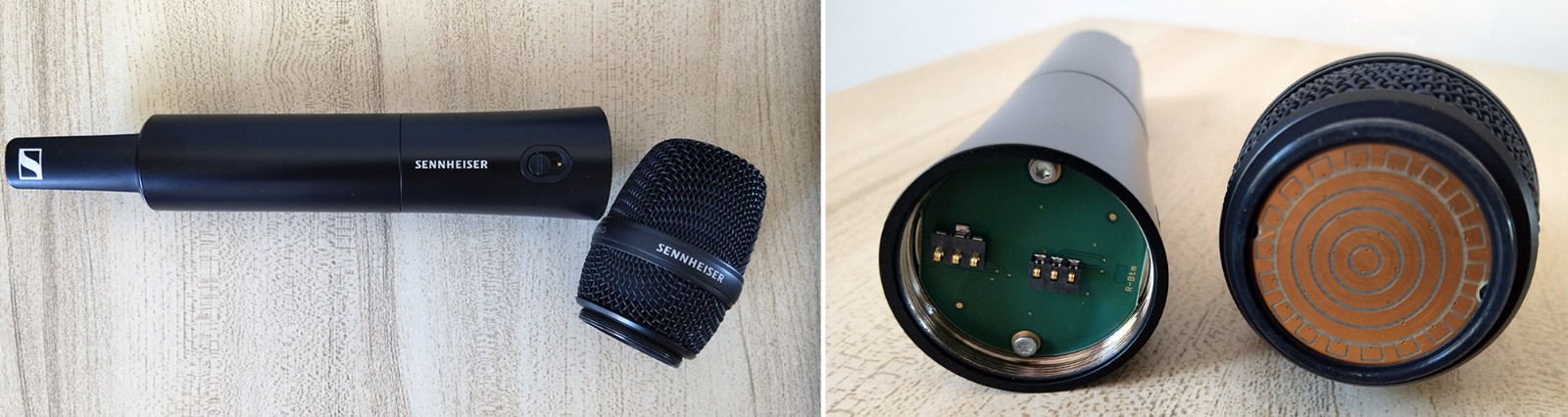 如图右,麦克风拾音头为触点式分离结构,与手持发射器通过六个镀金触点连接,螺丝扣锁定稳固。这种设计支持14款森海/纽曼音拾音头,可以灵活更换,适配人声、乐器等多元场景。例如,可更换纽曼KK205高灵敏度、高还原度拾音头。