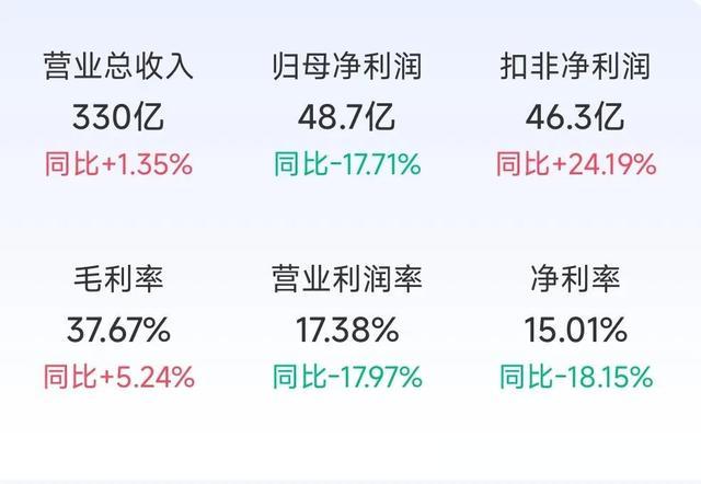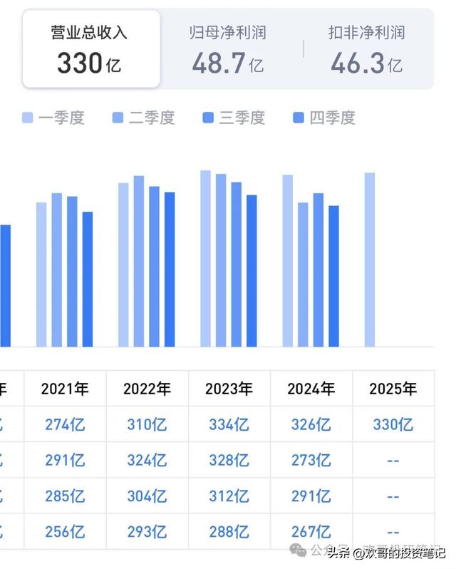 2025年一季度也呈现出良好的发展态势,营业总收入330.18亿元,同比增长1.35%,扣非归母净利润46.29亿元,同比增长24.19%,盈利能力逆势提升。