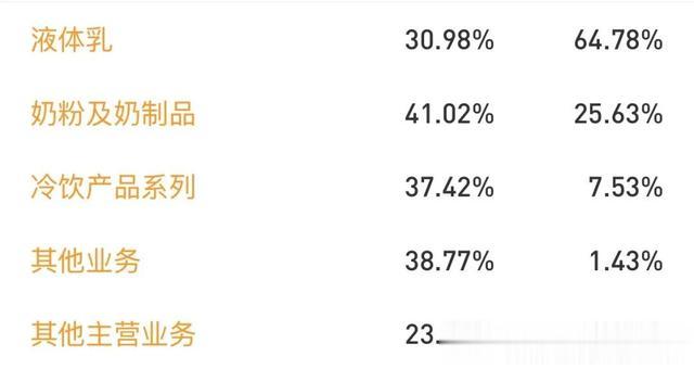 接着聊业务板块上,常温奶作为基本盘十分稳固,750亿营收里常温白奶市占率第一,常温酸奶还从蒙牛嘴里抢了1.4%的市场份额。