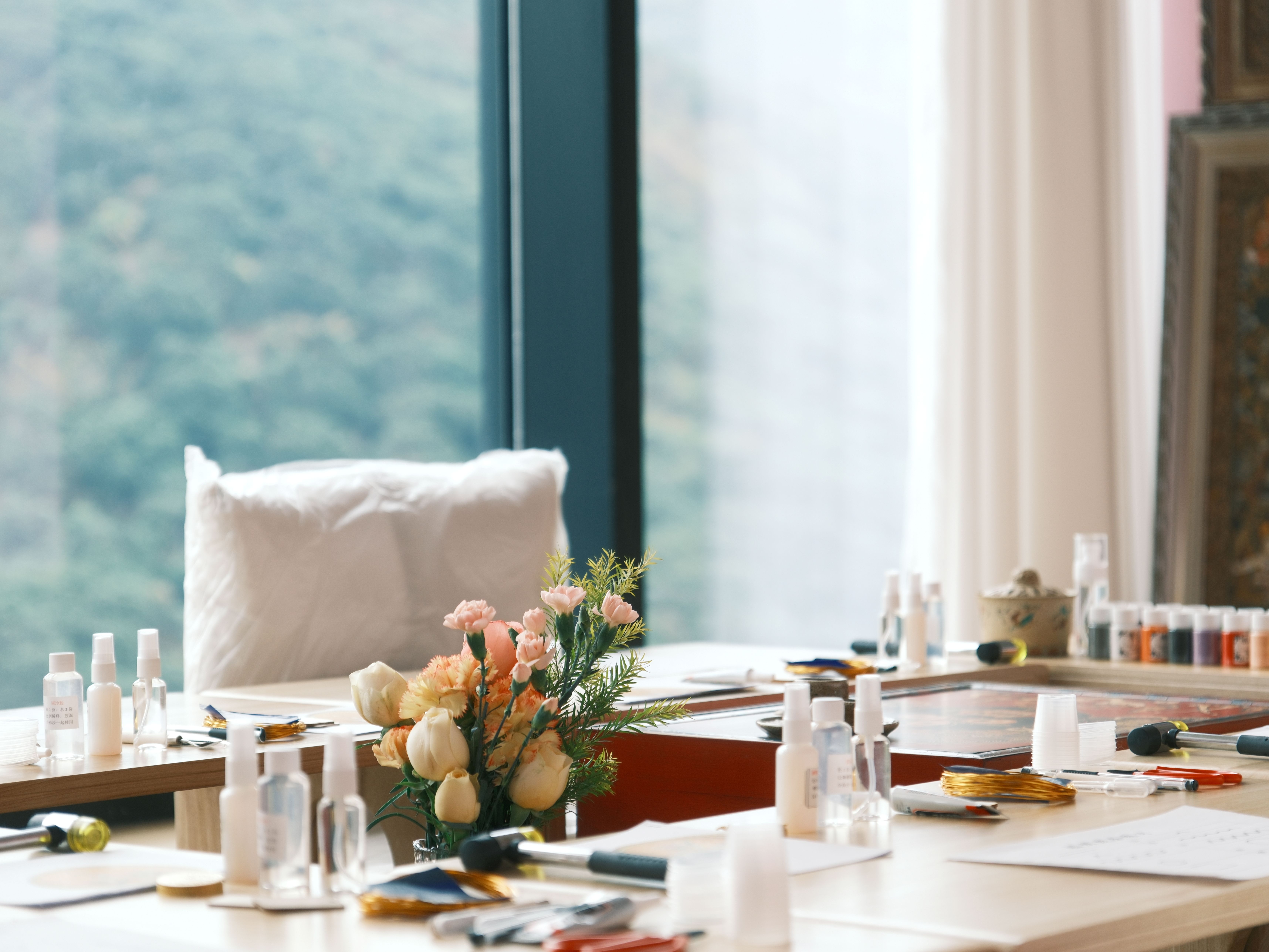 红、蓝、粉紫、绿四色展厅里,一场新手友好的掐丝唐卡 DIY 体验,让这份文化融合落地生根。展厅内,四色墙面分别陈列着不同风格的唐卡展品,蓝色墙面的彩唐温润雅致,红色展柜的造像庄严细腻,粉紫与绿色区域的体验区暖意融融,为新手营造出轻松的创作氛围。