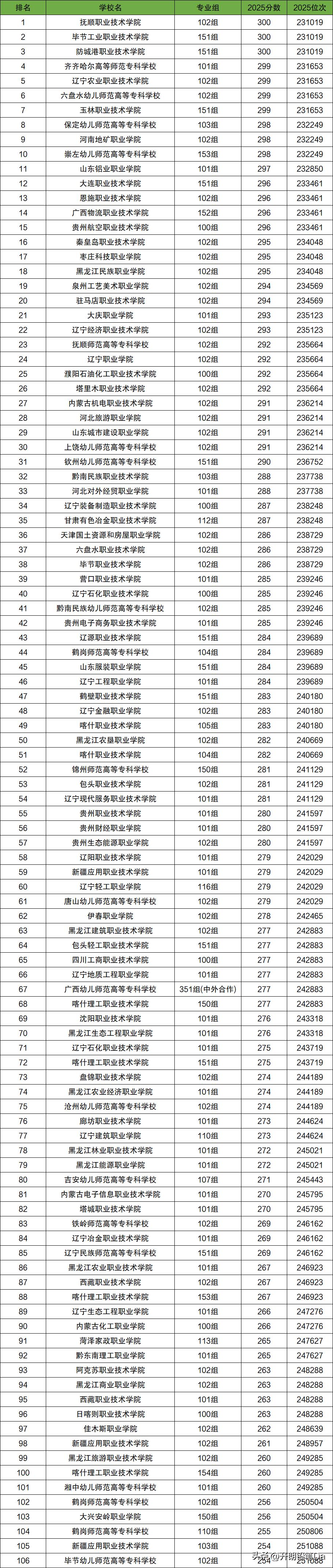 250到300分的公办专科大学排名下方表格以广西高考物理类2025年的招生情况为例,展示了全国250到300分的公办专科大学最低录取分数线排名,共计96所(106个院校专业组),供2026年高考生参考!