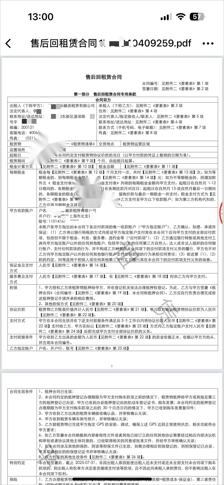 直到2026年3月11日,4S店才通过快递方式,将扣押了近十个月的换车及金融相关合同邮寄给白先生。拿到合同后他进一步确认,合同上已书面明确为60期(五年)售后回租金融租赁,与销售口头承诺的两年贷款完全相悖,且合同中诸多霸王条款,将所有风险和违约责任全部转嫁给承租人,4S店则通过全程隐瞒,让其在毫不知情的情况下签下这份“不平等条约”。