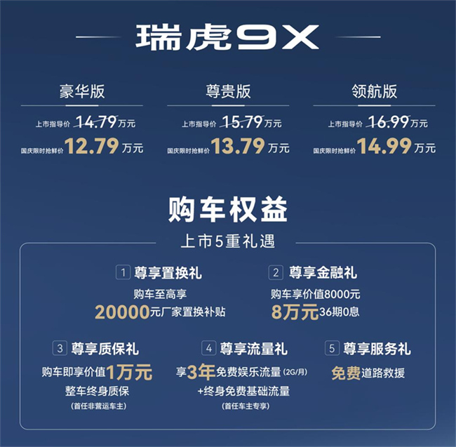 瑞虎9X共推出三个版本,豪华版指导价14.79万元、尊贵版15.79万元、领航版16.99万元。三个版本的国庆限时抢鲜价均比指导价低2万元。还有最高2万元厂家置换补贴、价值8000元的8万元36期0息金融方案、价值1万元整车终身质保(首任非营运车主)等购车权益。
