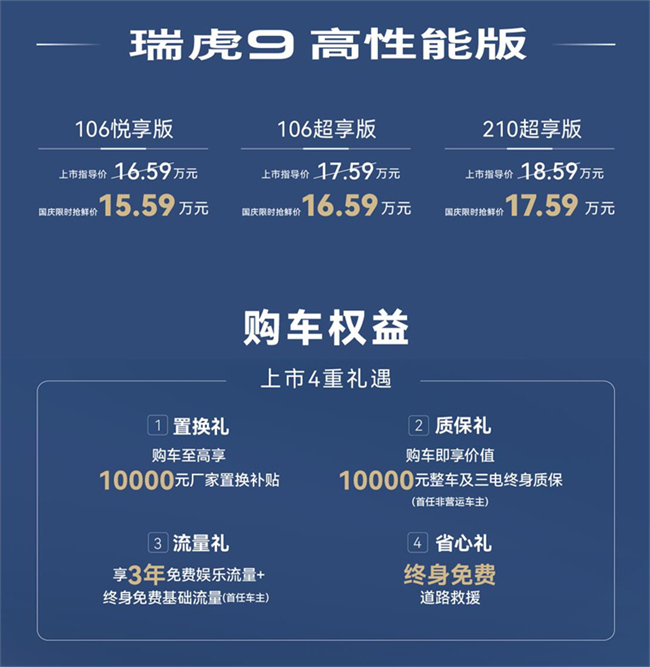 瑞虎9高性能版三个版本的指导价分别为16.59万元、17.59万元、18.59万元,国庆限时抢鲜价均低1万元。购车即享10000元厂家置换补贴、10000元整车及三电终身质保(首任非营运车主)等四重权益。