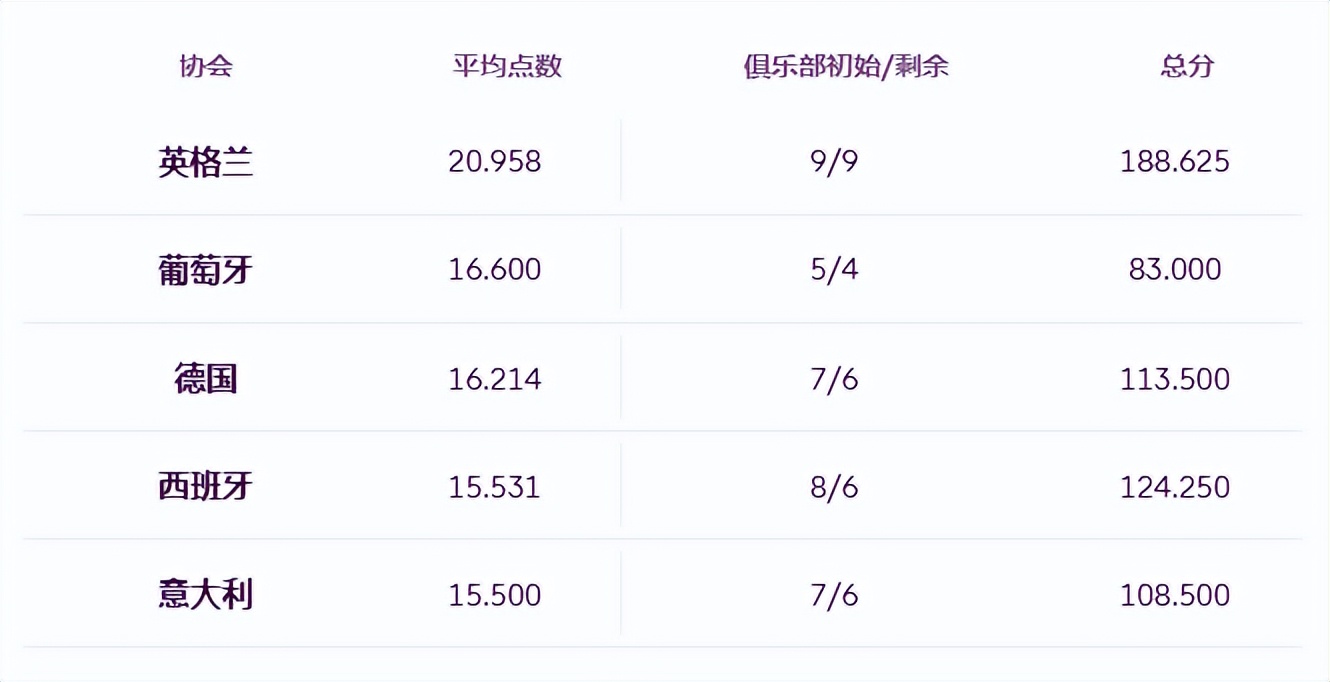 然后,把总分除以该联赛赛季初参加欧战的球队数量