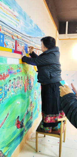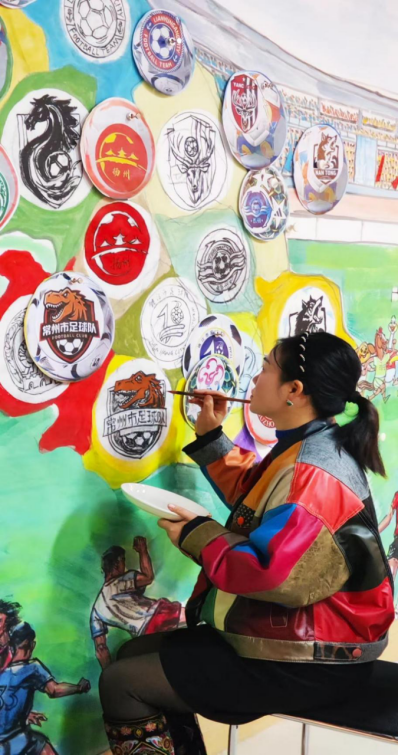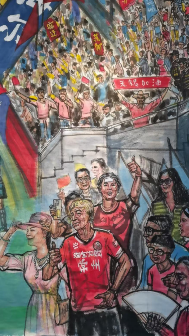 这幅国画打破了传统书画对静态场景的呈现惯性,以灵动的线条勾勒赛场张力,用浓淡相宜的墨色晕染激情氛围,更以饱满鲜活的色彩点亮细节,将江苏省城市足球联赛的 “活态场景” 完整搬进宣纸 —— 从憨态可掬的吉祥物到热情澎湃的球迷,从震撼人心的赛事高光到默契十足的团队互动,每一处笔墨都牵着赛场的温度,每一个形象都载着江苏的文旅精神。