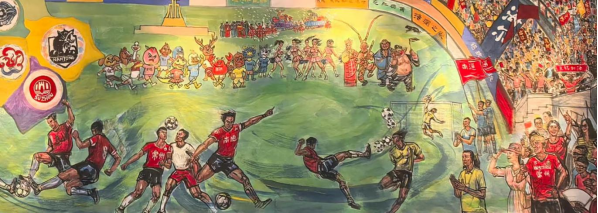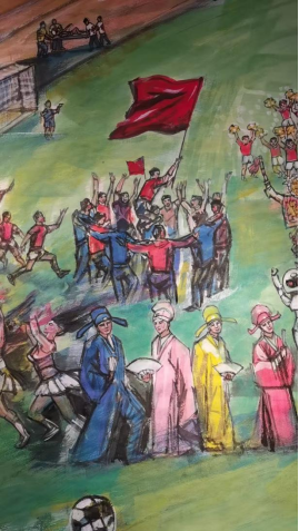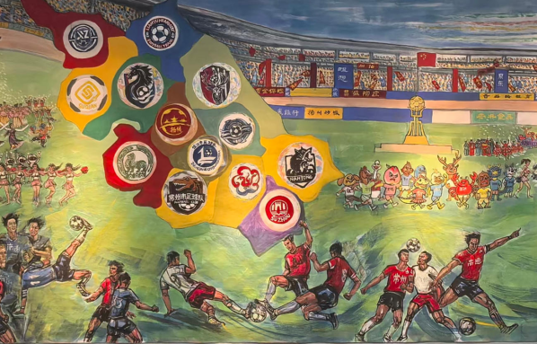 其二,是江苏城市精神与文体精神的集中彰显。画作中 13 支球队的队标与江苏省地图呼应,展现了江苏 “十三市联动” 的文体格局;泰州 11 号的倒挂金钩、镇江 47 号的英勇挡球,刻画的是 “拼搏不服输” 的文体精神;米卢观赛、球迷助威的场景,则传递出江苏对足球运动的热爱与包容。这些元素共同勾勒出江苏 “崇文尚武” 的城市气质,让画作成为展现江苏地域文化的 “视觉名片”。