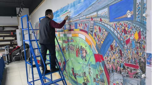 桑一田,号 “马语者”“人面兽心斋主”,中国当代著名画家,现任中国书画院副院长、北京智慧科学研究院一一客座教授、创作委员会主任。他自幼专攻画马、画狼,作品以阳刚大气、饱含生命张力著称,既承徐悲鸿奔马的神韵,又融入个人创新风格。其艺术成就早已跨越国界:作品被国家政协礼堂、神六航天组、2008 北京奥组委收藏,曾参与 “神系云南” 巨屏创作、昆明新机场 3×30 米巨幅壁画绘制,更曾为第 66 届联合国大会创作 “多彩中华” 长卷,纪录片登陆纽约时报广场纳斯达克大屏。此次主笔人物,桑一田以利落的线条勾勒球员的拼搏姿态、球迷的热情神情,将足球运动的动感与力量感融入笔墨,让每一个人物都兼具 “形” 的生动与 “神” 的鲜活,完美诠释了 “体育之美” 与 “艺术之美” 的交融。