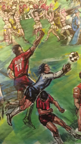 其一,是传统艺术与现代体育的破壁联动。国画作为中国传统艺术的核心载体,历来多表现山水、花鸟、历史人物,而这幅作品却将视角对准 “足球联赛” 这一充满现代活力的竞技场景:用毛笔勾勒射门的弧线,用墨色渲染赛场的激情,既打破了传统国画的题材边界,也让足球运动的 “速度与力量” 通过传统笔墨得到独特诠释,为两种文化形态找到了共鸣点。