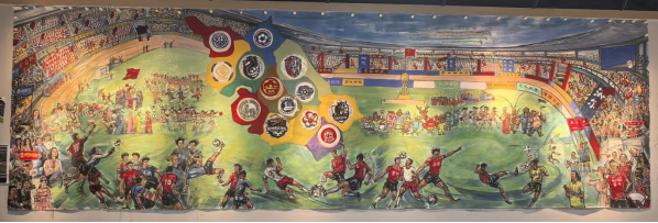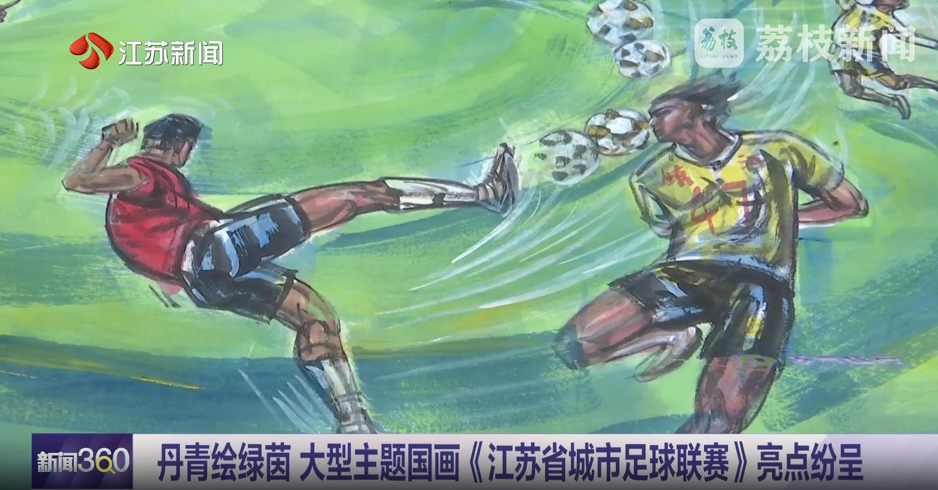 当江苏省城市足球联赛的绿茵激情在赛场绽放,一场跨越传统艺术与现代文旅的创作也悄然酝酿。近日,以赛事为核心的大型主题国画《江苏省城市足球联赛》正式落成,尺寸为 2.5 米 ×9 米,这幅作品由著名书画家朱文总策划布局设计,知名画家桑一田主笔人物创作,中国书法家协会会员邓凌鹰、黄石、陈吉安联袂担当书法题字,以笔墨为媒,将江苏足球的热血瞬间与城市风采定格成永恒的艺术篇章。