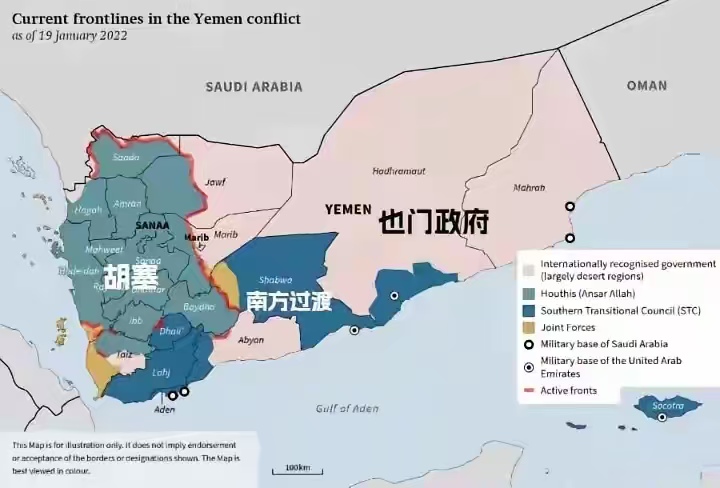 还有一个不能忽视的角色——胡塞武装。这个控制着也门北部和中部的武装力量,一直和沙特、阿联酋对着干。