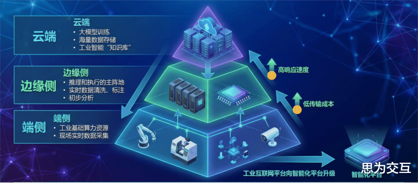 在新的架构下,算力呈金字塔形分布。云端负责大模型的训练和海量数据的存储,是工业智能的“知识库”。边缘侧则是推理和执行的主阵地,负责对现场实时数据进行清洗、标注和初步分析。这不仅提高了响应速度,还大幅降低了数据传输成本。工业基础算力资源和应用能力的融合,将促使工业互联网平台向智能化平台升级。