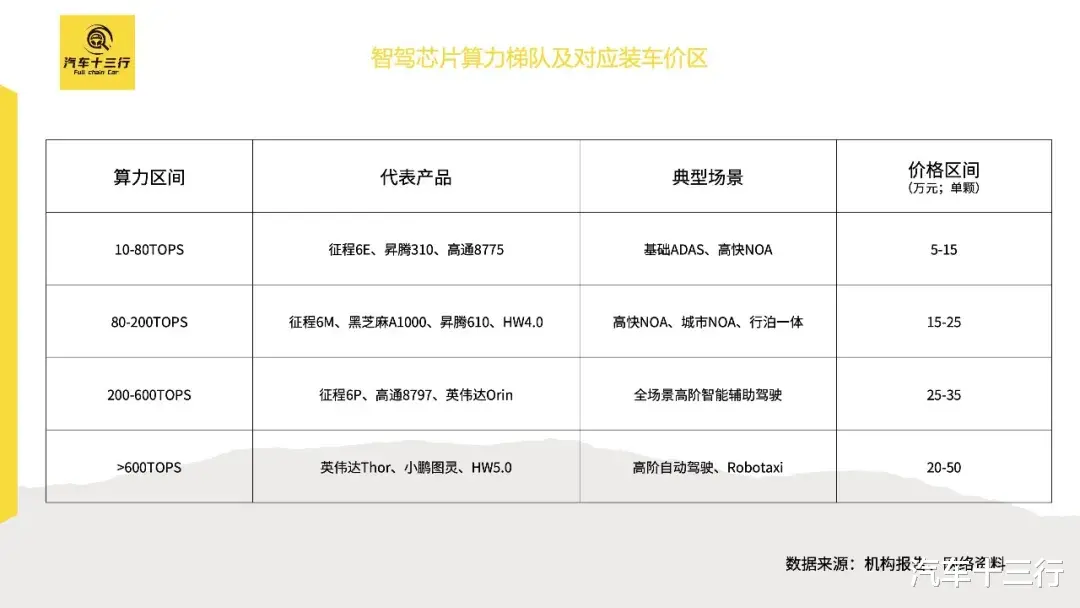 在2022~2024年之间,行业内普遍认为实现高速NOA需要30-50TOPS算力,而实现城市NOA因为需要识别信号灯、无保护左转、绕行障碍等功能,因此门槛极高,起步至少要200-500TOPS,甚至为留足算力冗余需要1000TOPS的芯片。