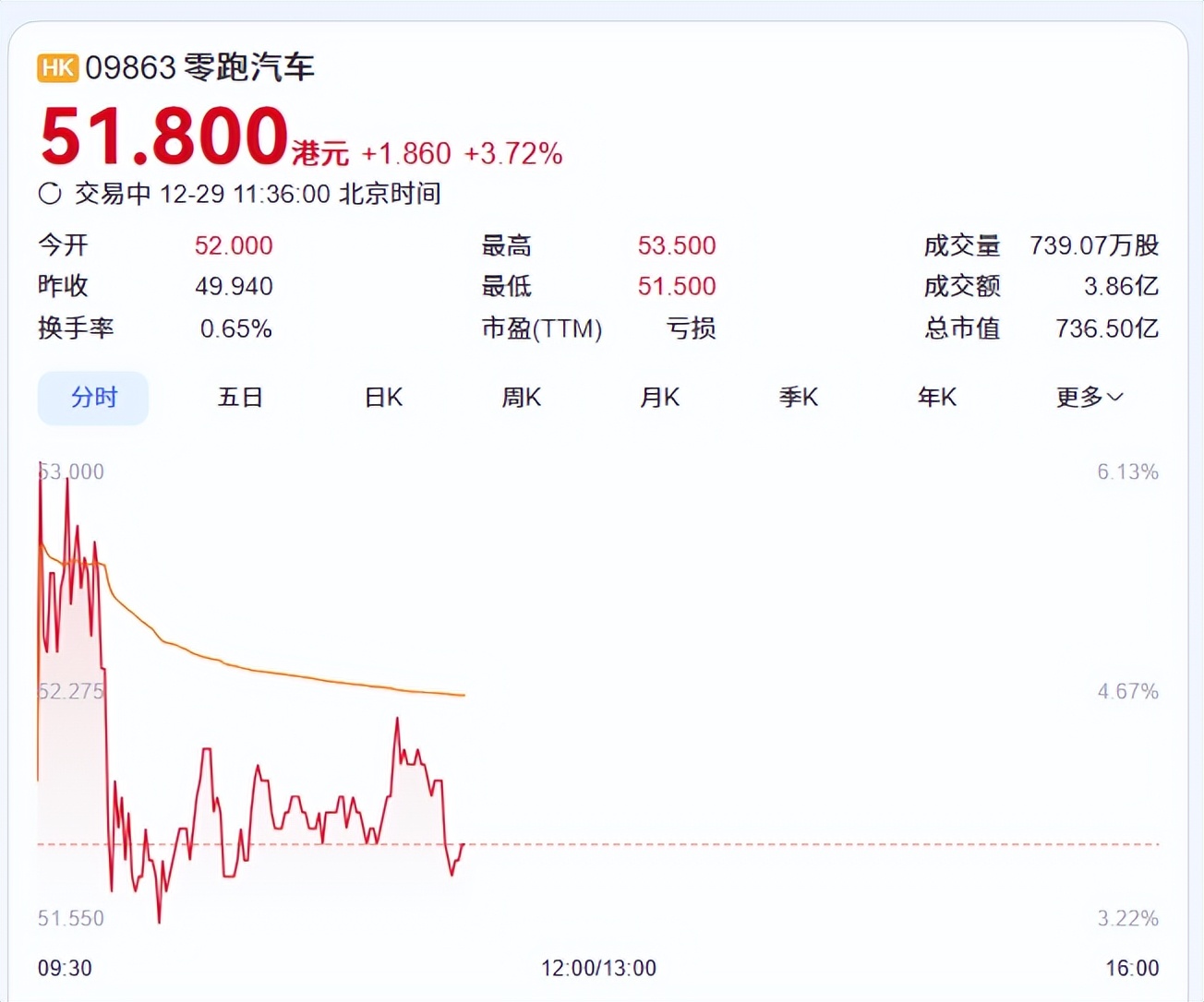 12月29日,零跑汽车发布公告称,与一汽股权投资签署内资股认购协议,拟以每股人民币50.03元(相当于港币55.29元)的价格向一汽股权发行7483.2万股内资股,总金额为人民币37.44亿元。本次发行的内资股占公司扩大后已发行内资股总数的20.47%,占扩大后已发行股份总数的5%。受此消息影响,零跑汽车开盘大涨。截至发稿,零跑汽车港股报51.8港元/股,涨3.72%。