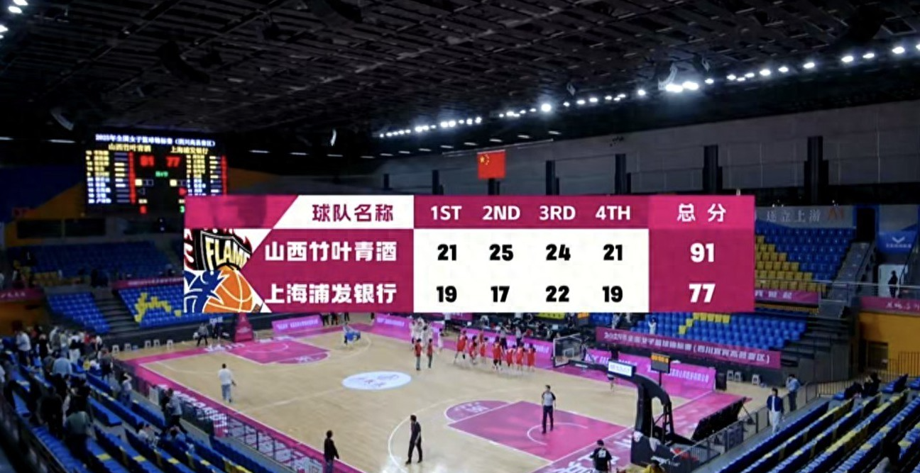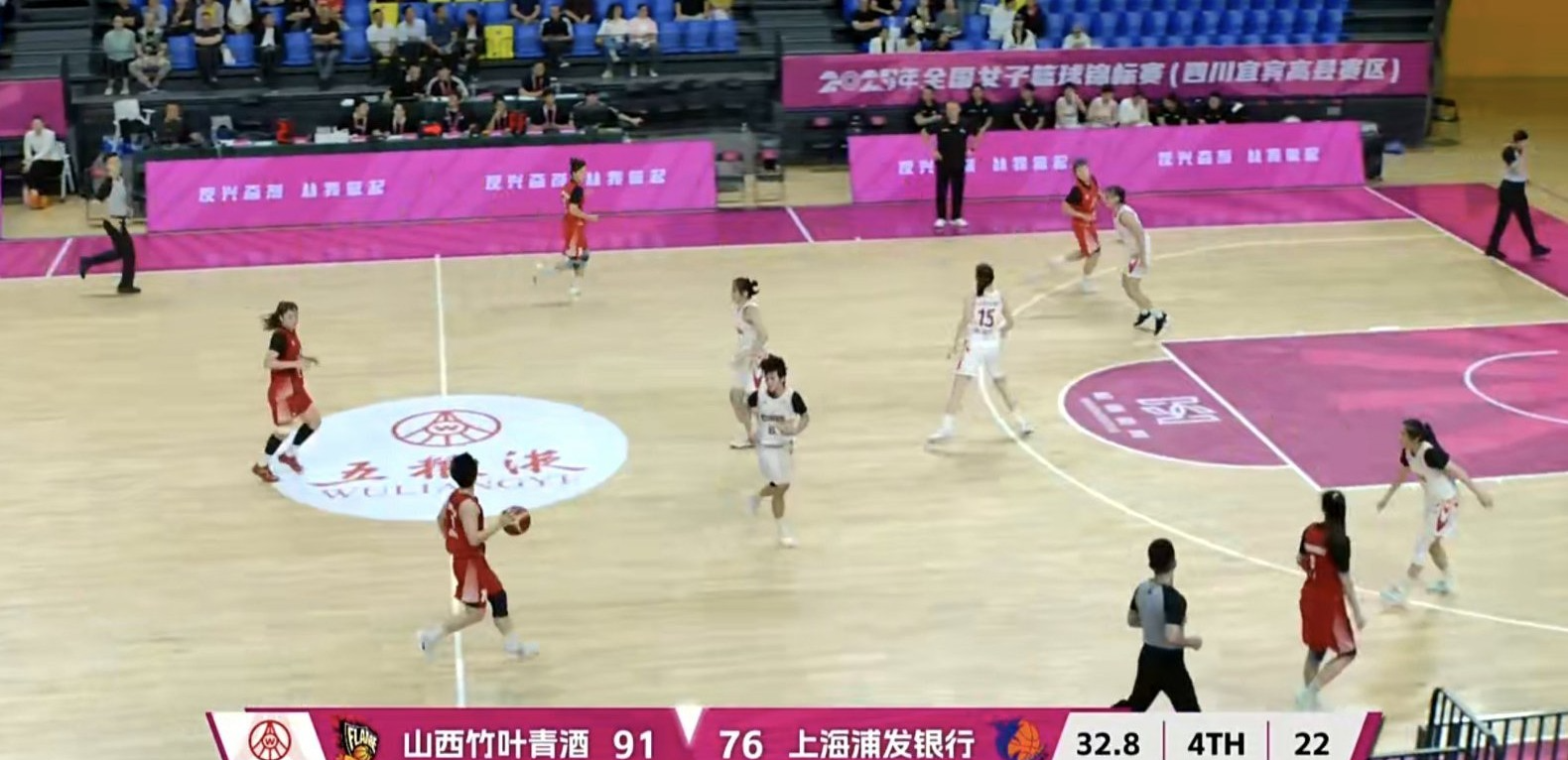 最后5分钟。前一分钟双方均无得分。翟若云抢板二次进攻打成2+1,山西85比65!王樱霓反击得到2分,张懿三分不中,又是王樱霓反击打进,宋柯昕短跑篮下打进。最后2分钟,上海罚篮中2,山西李海娜换下翟若云,张懿持球中投打进,刘璐三分飙进、反击2分,连拿5分。宋柯昕突破打进,王樱霓罚篮中1。最后27.9秒,山西女篮控球弃战。全场比赛结束,山西竹叶青酒女篮91比77上海浦发银行女篮。