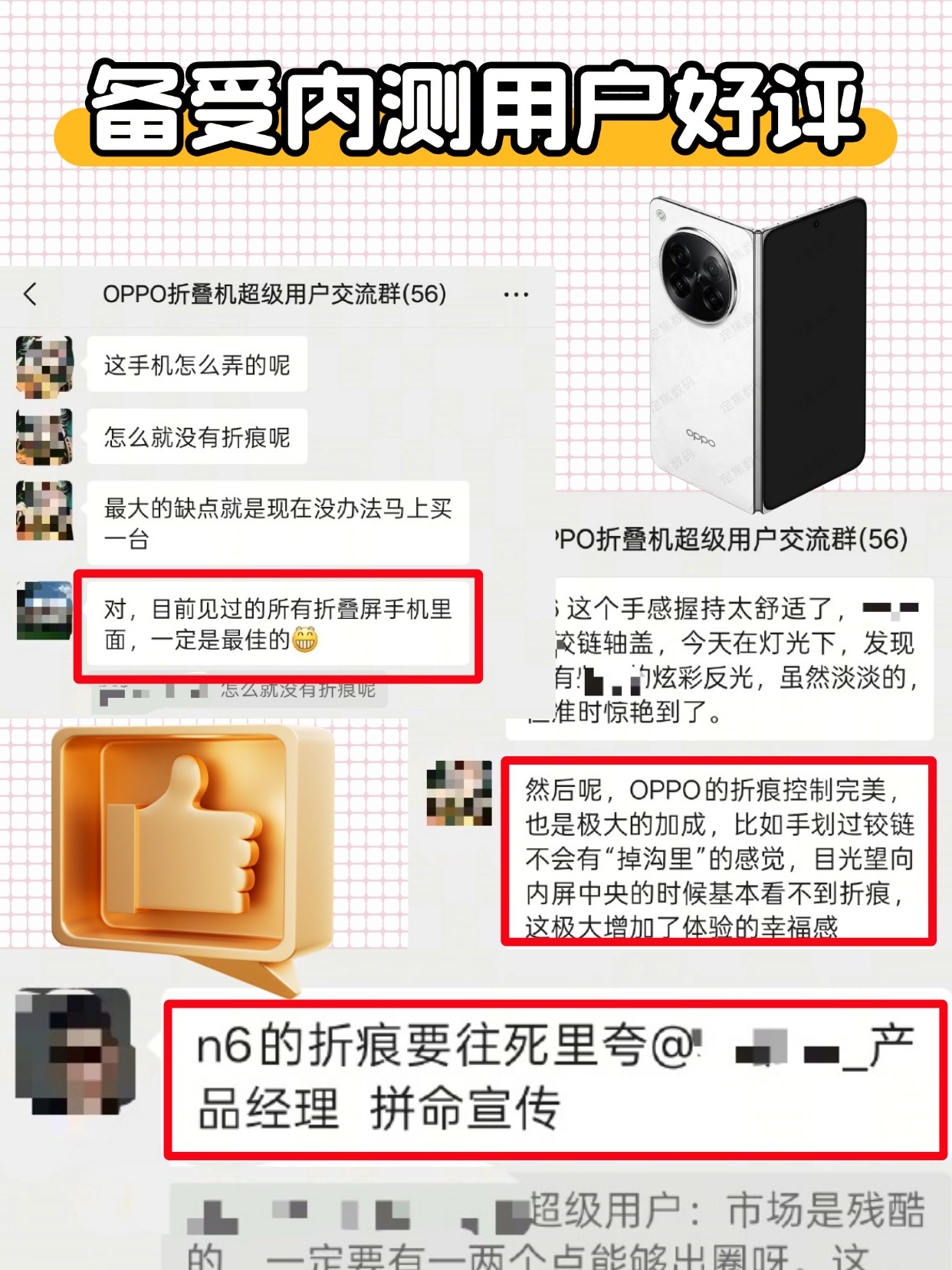 最近OPPO周意保还分享了一些内测用户的真实反馈:“目前最大缺点:买不到”、“屏幕观感,折叠屏里最佳”、“手指划过铰链没有掉沟里的感觉”,每一句仿佛都在说:这折痕控制,真的稳了!