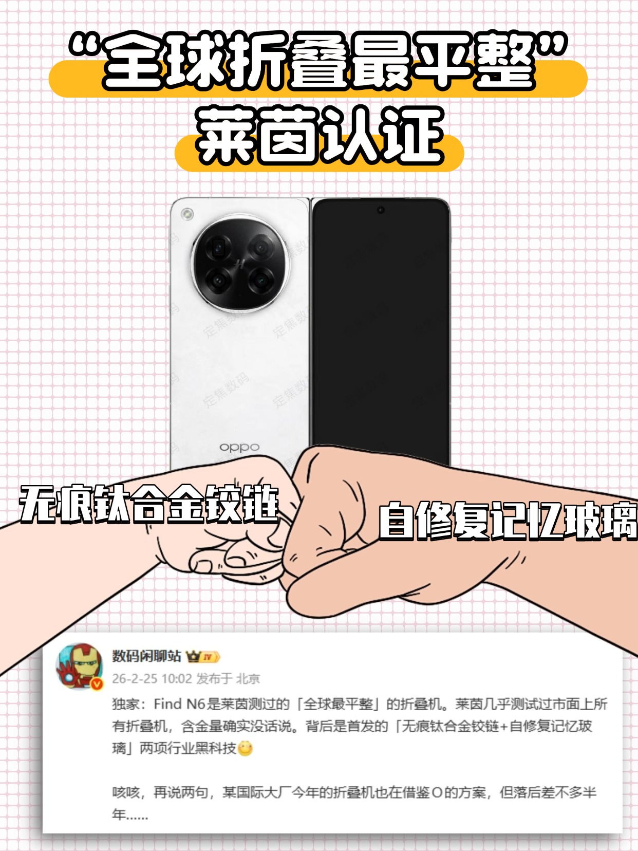报道里说,OPPO为了做到这种“无痕效果”整整研发了三年!网传是在研发「无痕钛合金铰链」+「自修复记忆玻璃」这两项黑科技,听着就很有东西!